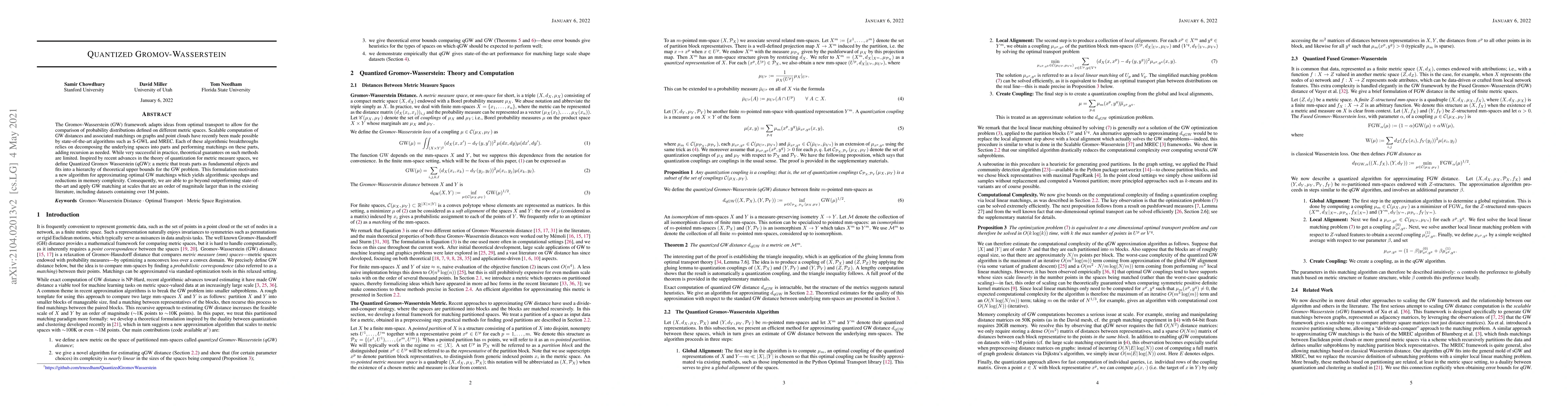 The paper introduces Quantized Gromov-Wasserstein (qGW), a new metric that decomposes metric spaces into parts for scalable computation, offering theoretical upper bounds and algorithmic speedups. This approach enables GW matching on significantly larger datasets, surpassing existing methods.