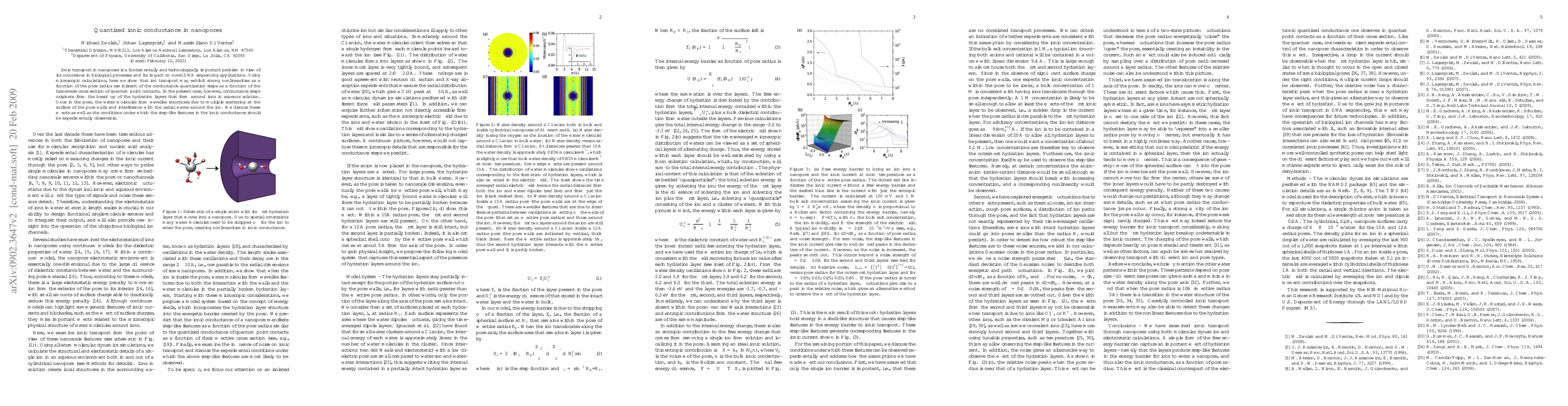 This paper demonstrates that ion transport through nanopores can exhibit quantized conductance steps due to the breakup of hydration layers and wavelike structures formed by water molecules inside the pore. The study suggests these step-like features in ionic conductance could be experimentally observable under specific conditions.