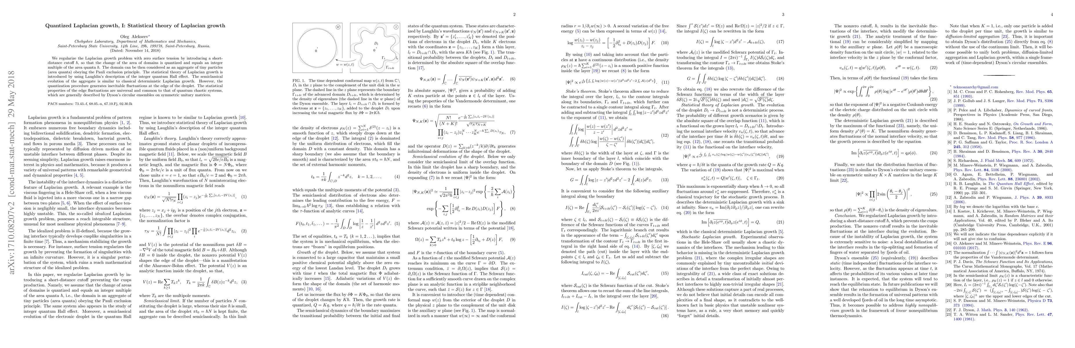We regularize the Laplacian growth problem with zero surface tension by introducing a short-distance cutoff $\hbar$, so that the change of the area of domains is quantized and equals an integer multiple of the area quanta $\hbar$. The domain can be then considered as an aggregate of tiny particles (area quanta) obeying the Pauli exclusion principle. The statistical theory of Laplacian growth is introduced by using Laughlin's description of the integer quantum Hall effect. The semiclassical evolution of the aggregate is similar to classical deterministic Laplacian growth. However, the quantization procedure generates inevitable fluctuations at the edge of the droplet. The statistical properties of the edge fluctuations are universal and common to that of quantum chaotic systems, which are generally described by Dyson's circular ensembles on symmetric unitary matrices.