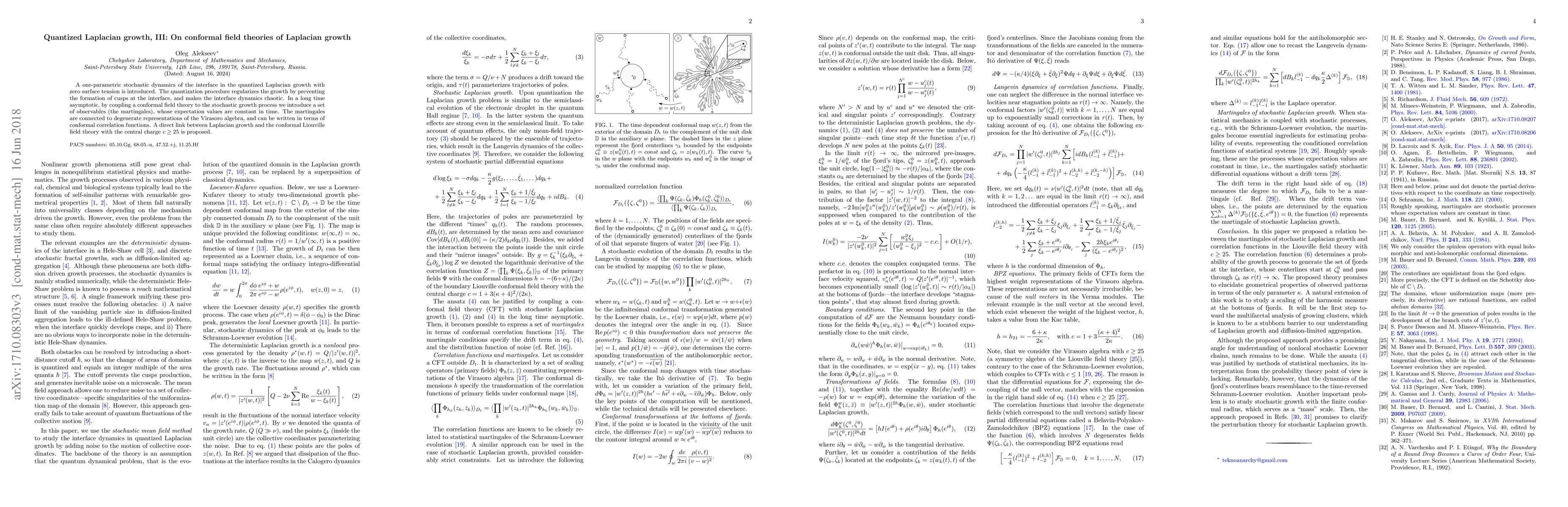 This paper introduces a stochastic dynamics for quantized Laplacian growth, which regularizes the growth by preventing cusp formation and introduces chaotic interface dynamics. The study connects this growth process to conformal field theories, proposing a link between Laplacian growth and conformal Liouville field theory with a central charge $c\geq25$.