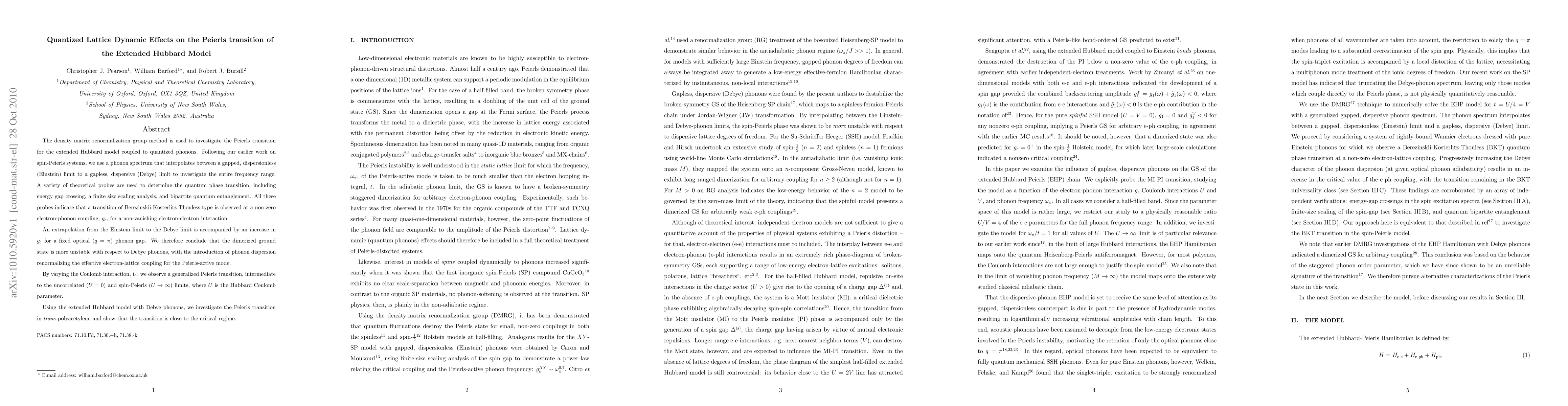 The density matrix renormalization group method is used to investigate the Peierls transition for the extended Hubbard model coupled to quantized phonons. Following our earlier work on spin-Peierls systems, we use a phonon spectrum that interpolates between a gapped, dispersionless (Einstein) limit to a gapless, dispersive (Debye) limit to investigate the entire frequency range. A variety of theoretical probes are used to determine the quantum phase transition, including energy gap crossing, a finite size scaling analysis, and bipartite quantum entanglement. All these probes indicate that a transition of Berezinskii-Kosterlitz-Thouless-type is observed at a non-zero electron-phonon coupling, $g_{\text c}$, for a non-vanishing electron-electron interaction. An extrapolation from the Einstein limit to the Debye limit is accompanied by an increase in $g_{\text c}$ for a fixed optical ($q=\pi $) phonon gap. We therefore conclude that the dimerized ground state is more unstable with respect to Debye phonons, with the introduction of phonon dispersion renormalizing the effective electron-lattice coupling for the Peierls-active mode. By varying the Coulomb interaction, $U$, we observe a generalized Peierls transition, intermediate to the uncorrelated ($U=0$) and spin-Peierls ($U\to\infty$) limits, where $U$ is the Hubbard Coulomb parameter. Using the extended Hubbard model with Debye phonons, we investigate the Peierls transition in \textit{trans}-polyacetylene and show that the transition is close to the critical regime.