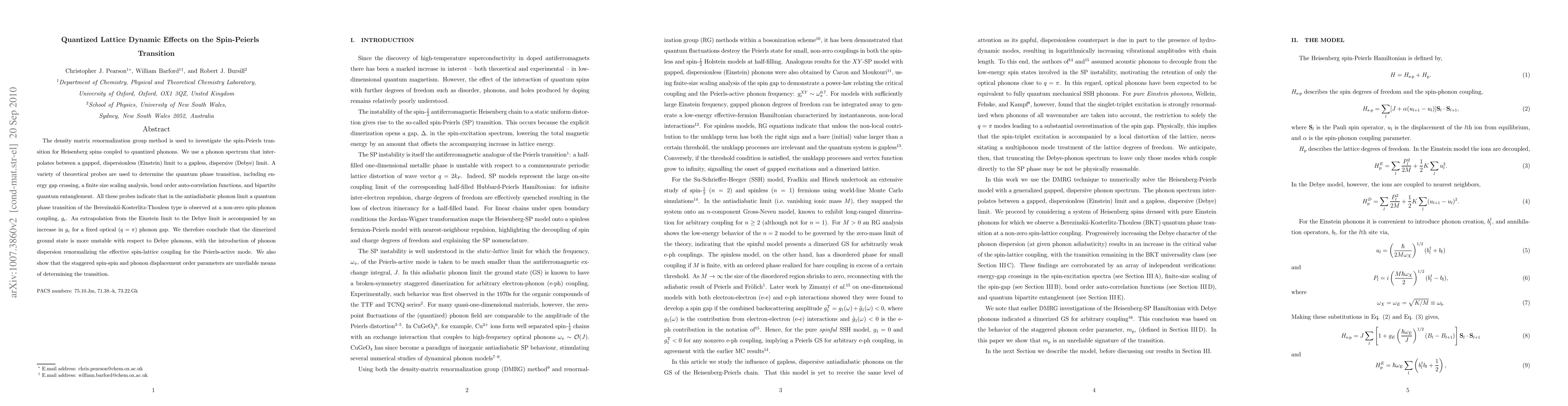 The density matrix renormalization group method is used to investigate the spin-Peierls transition for Heisenberg spins coupled to quantized phonons. We use a phonon spectrum that interpolates between a gapped, dispersionless (Einstein) limit to a gapless, dispersive (Debye) limit. A variety of theoretical probes are used to determine the quantum phase transition, including energy gap crossing, a finite size scaling analysis, bond order auto-correlation functions, and bipartite quantum entanglement. All these probes indicate that in the antiadiabatic phonon limit a quantum phase transition of the Berezinskii-Kosterlitz-Thouless type is observed at a non-zero spin-phonon coupling, $g_{\text c}$. An extrapolation from the Einstein limit to the Debye limit is accompanied by an increase in $g_{\text c}$ for a fixed optical ($q=\pi $) phonon gap. We therefore conclude that the dimerized ground state is more unstable with respect to Debye phonons, with the introduction of phonon dispersion renormalizing the effective spin-lattice coupling for the Peierls-active mode. We also show that the staggered spin-spin and phonon displacement order parameters are unreliable means of determining the transition.