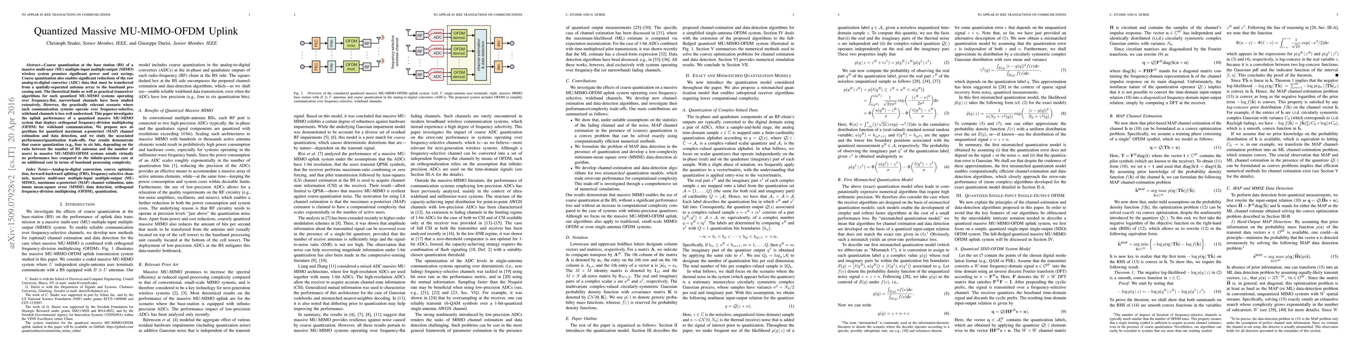 The paper investigates the uplink performance of a quantized massive MU-MIMO-OFDM system, proposing new algorithms for quantized MAP channel estimation and data detection, and analyzing performance/quantization trade-offs over frequency-selective, wideband channels.