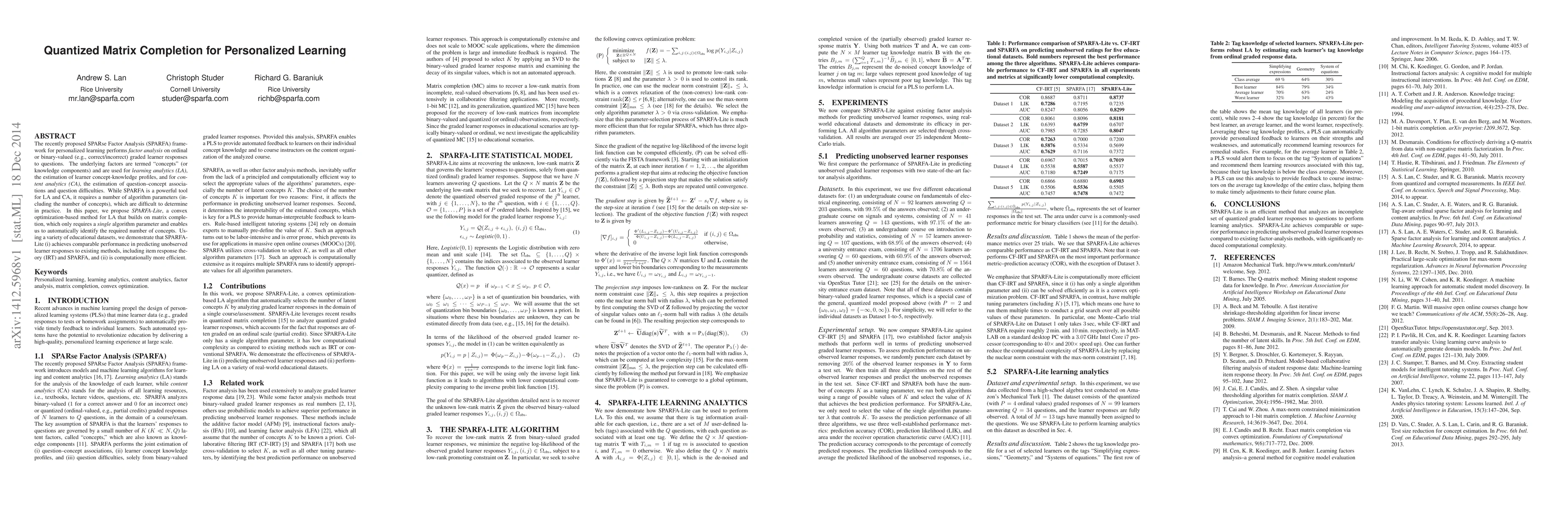 The recently proposed SPARse Factor Analysis (SPARFA) framework for personalized learning performs factor analysis on ordinal or binary-valued (e.g., correct/incorrect) graded learner responses to questions. The underlying factors are termed "concepts" (or knowledge components) and are used for learning analytics (LA), the estimation of learner concept-knowledge profiles, and for content analytics (CA), the estimation of question-concept associations and question difficulties. While SPARFA is a powerful tool for LA and CA, it requires a number of algorithm parameters (including the number of concepts), which are difficult to determine in practice. In this paper, we propose SPARFA-Lite, a convex optimization-based method for LA that builds on matrix completion, which only requires a single algorithm parameter and enables us to automatically identify the required number of concepts. Using a variety of educational datasets, we demonstrate that SPARFALite (i) achieves comparable performance in predicting unobserved learner responses to existing methods, including item response theory (IRT) and SPARFA, and (ii) is computationally more efficient.