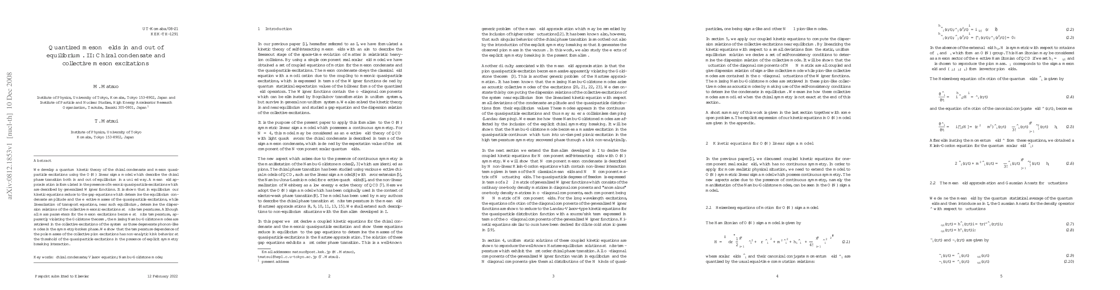 This paper develops a quantum kinetic theory for the chiral condensate and meson quasi-particle excitations using the O(N) linear sigma model, showing how it describes the chiral phase transition both in and out of equilibrium. The theory reveals the temperature dependence of collective mesonic excitations and retrieves missing Nambu-Goldstone modes as phonon-like modes in the symmetry-broken phase.