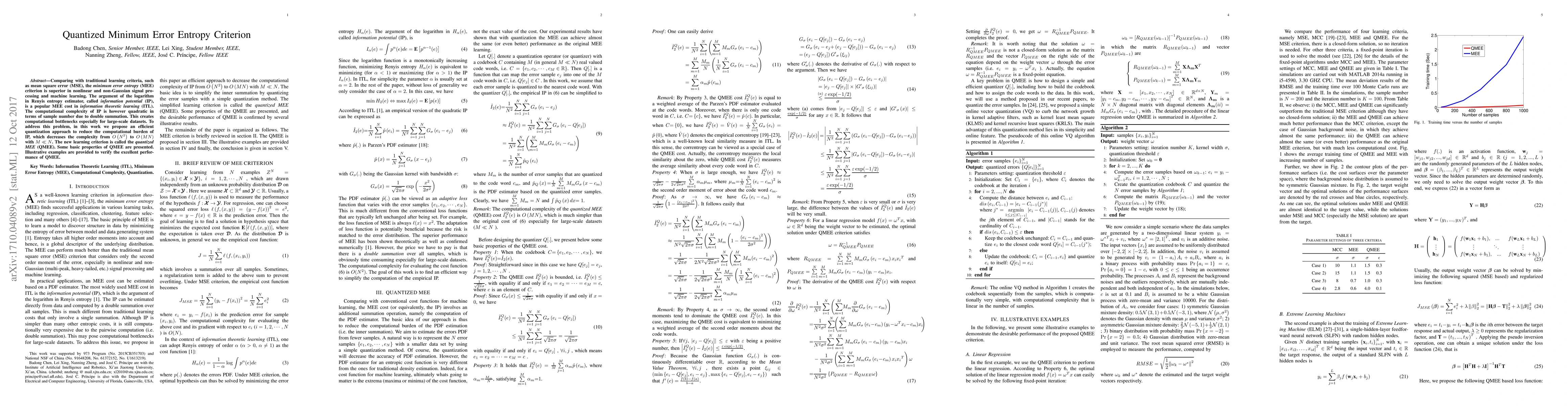 This paper proposes a quantized minimum error entropy (QMEE) criterion to reduce computational complexity in information theoretic learning. The traditional minimum error entropy (MEE) method, while effective, has quadratic complexity. The new QMEE approach reduces complexity from O(N^2) to O(MN), significantly easing computational burdens for large datasets.