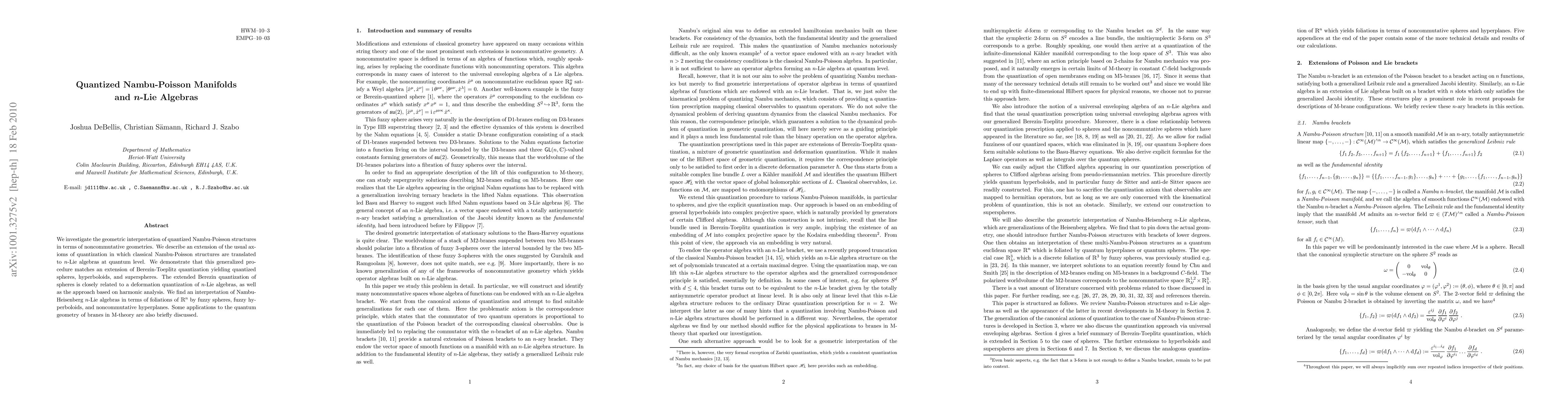 This paper explores the quantization of Nambu-Poisson structures using noncommutative geometry, extending Berezin-Toeplitz quantization to produce quantized spheres and other shapes. It connects classical Nambu-Poisson structures to n-Lie algebras and discusses applications to the quantum geometry of branes in M-theory.