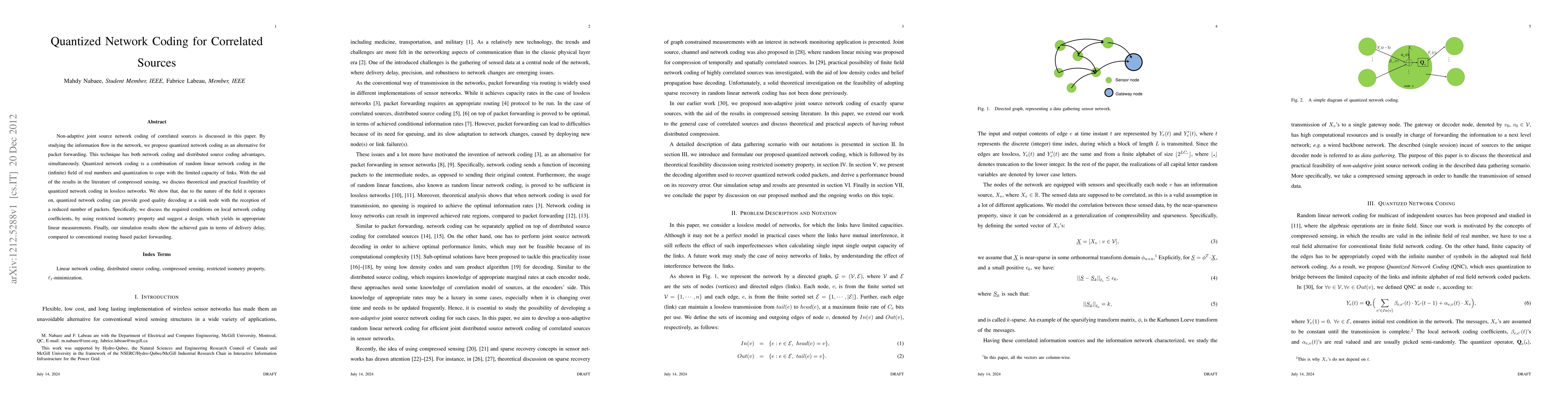 This paper proposes quantized network coding as a method for non-adaptive joint source coding in correlated sources, combining network coding and distributed source coding advantages. It demonstrates improved delivery delay compared to conventional routing, leveraging random linear coding and quantization to manage limited link capacity.