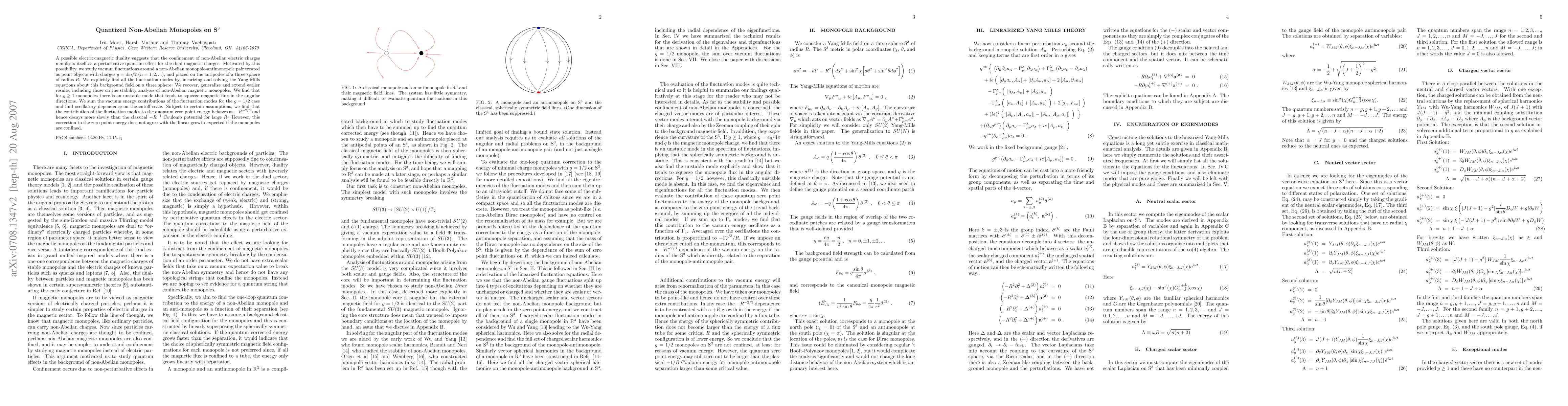 This paper investigates quantized non-Abelian monopoles on S^3, finding fluctuation modes and analyzing their vacuum energy contributions. The study reveals an unstable mode and an oscillatory vacuum energy decay rate of -R^{-2/3}, which contrasts with the expected linear growth for confined monopoles.