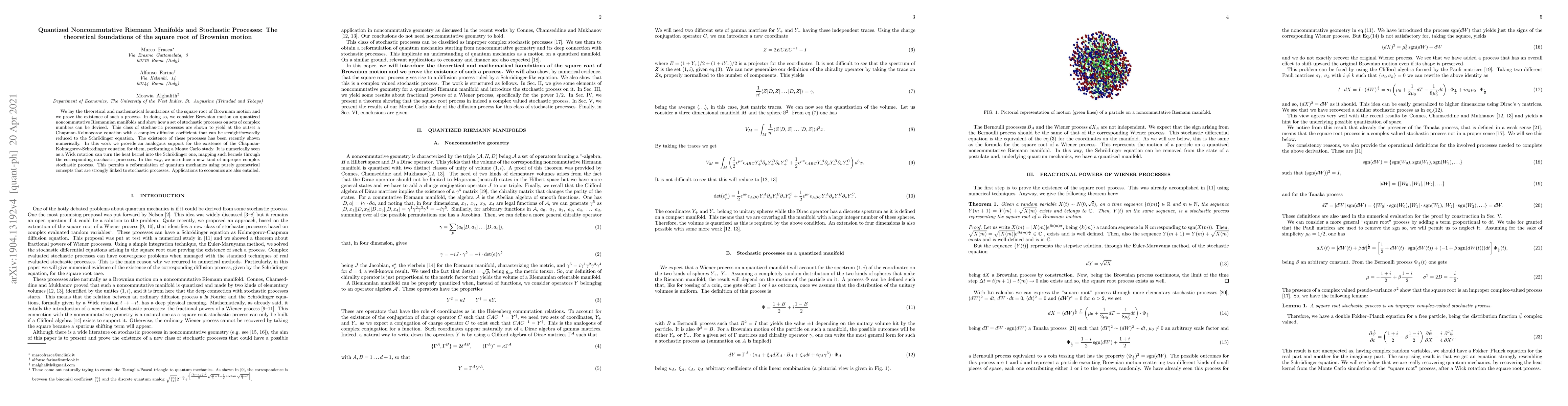 We lay the theoretical and mathematical foundations of the square root of Browniam motion and we prove the existence of such a process. In doing so, we consider Brownian motion on quantized noncommutative Riemannian manifolds and show how a set of stochastic processes on sets of complex numbers can be devised. This class of stochastic processes are shown to yield at the outset a Chapman-Kolmogorov equation with a complex diffusion coefficient that can be straightforwardly reduced to the Schr\"odinger equation. The existence of these processes has been recently shown numerically. In this work we provide an analogous support for the existence of the Chapman-Kolmogorov-Schr\"odinger equation for them, performing a Monte Carlo study. It is numerically seen as a Wick rotation can turn the heat kernel into the Schr\"odinger one, mapping such kernels through the corresponding stochastic processes. In this way, we introduce a new kind of improper complex stochastic process. This permits a reformulation of quantum mechanics using purely geometrical concepts that are strongly linked to stochastic processes. Applications to economics are also entailed.