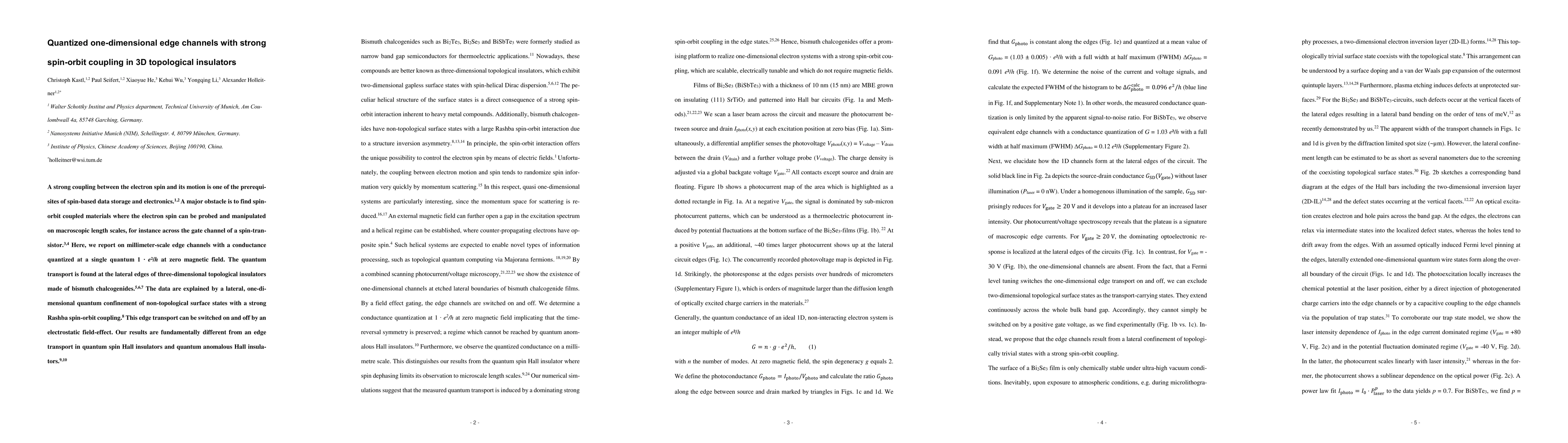 This paper reports on quantized conductance in millimeter-scale edge channels of 3D topological insulators with strong spin-orbit coupling, demonstrating a conductance quantized at a single quantum. The findings reveal fundamental differences from quantum spin Hall and anomalous Hall insulators, showcasing the potential for spin-based electronics.