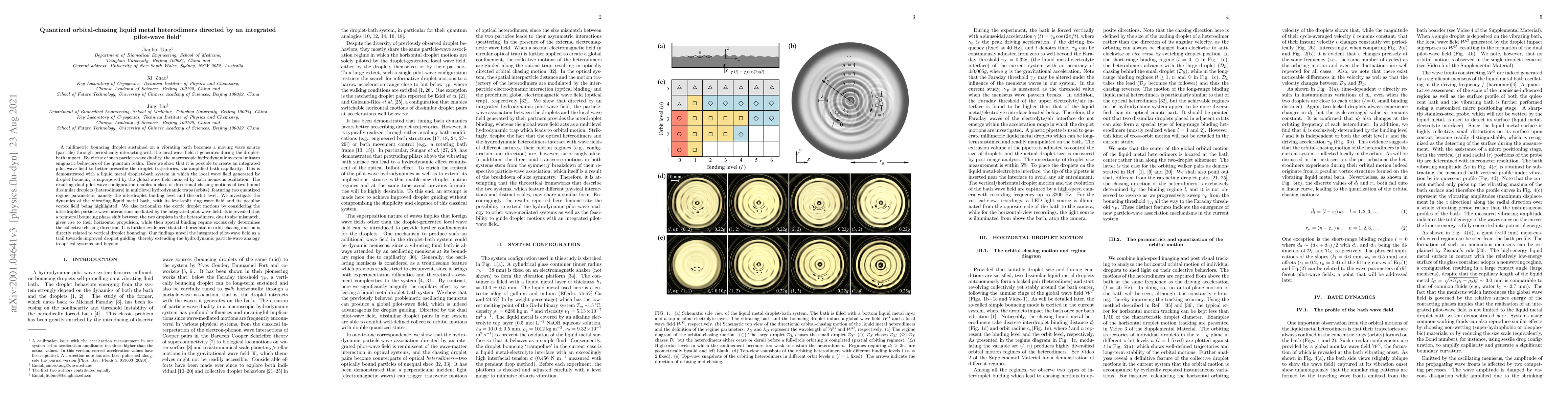 This research demonstrates the creation of a pilot-wave field to guide the motion of two dissimilar liquid metal droplets (heterodimers) in quantized orbits on a vibrating bath. The droplets exhibit particle-wave duality, mimicking quantum behaviors. The pilot-wave field, amplified by bath capillarity, enables directional chasing motions, with quantized regime parameters determined by interdroplet binding and orbit levels. The study reveals that temporal phase shifts and spatial binding regimes influence horizontal propulsion and collective direction, extending the particle-wave analogy to optical systems.