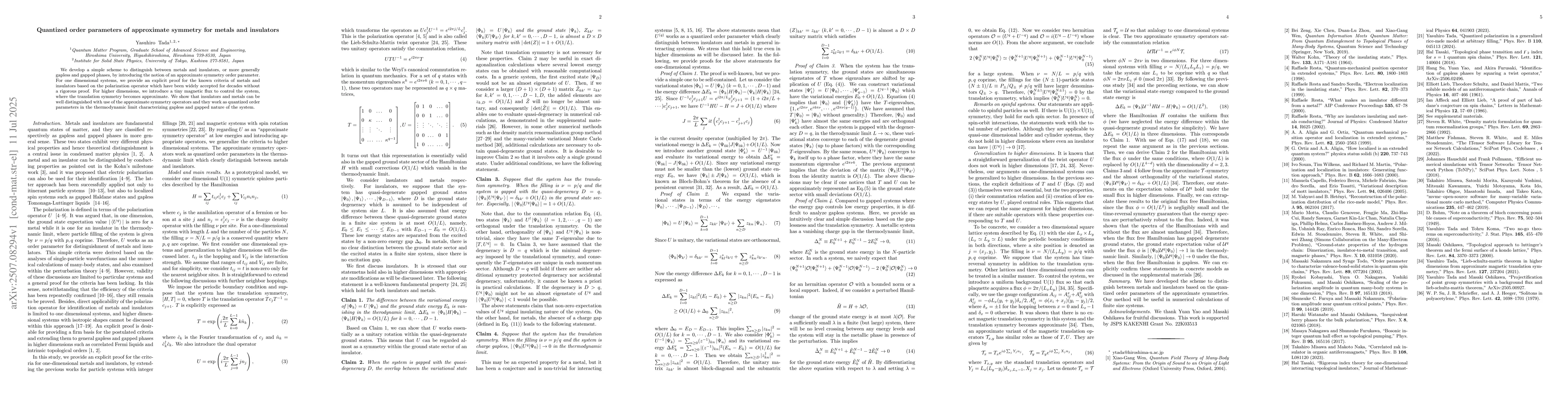 We develop a simple scheme to distinguish between metals and insulators, or more generally gapless and gapped phases, by introducing the notion of an approximate symmetry order parameter. For one dimensional systems, we provide an explicit proof for the known criteria of metals and insulators based on the polarization operator which have been widely accepted for decades without a rigorous proof. For higher dimensions, we introduce a tiny magnetic flux to control the system, where the translation symmetry becomes approximate. We show that insulators and metals can be well distinguished with use of the approximate symmetry operators and they work as quantized order parameters in the thermodynamic limit characterizing gapless and gapped nature of the system.