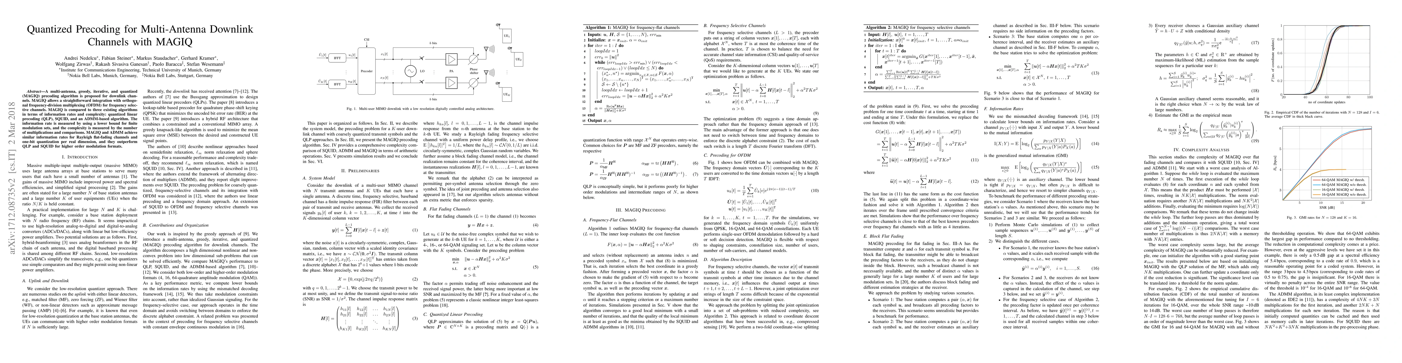 A multi-antenna, greedy, iterative, and quantized (MAGIQ) precoding algorithm is proposed for downlink channels. MAGIQ allows a straightforward integration with orthogonal frequency-division multiplexing (OFDM). MAGIQ is compared to three existing algorithms in terms of information rates and complexity: quantized linear precoding (QLP), SQUID, and an ADMM-based algorithm. The information rate is measured by using a lower bound for finite modulation sets, and the complexity is measured by the number of multiplications and comparisons. MAGIQ and ADMM achieve similar information rates with similar complexity for Rayleigh flat-fading channels and one-bit quantization per real dimension, and they outperform QLP and SQUID for higher order modulation.