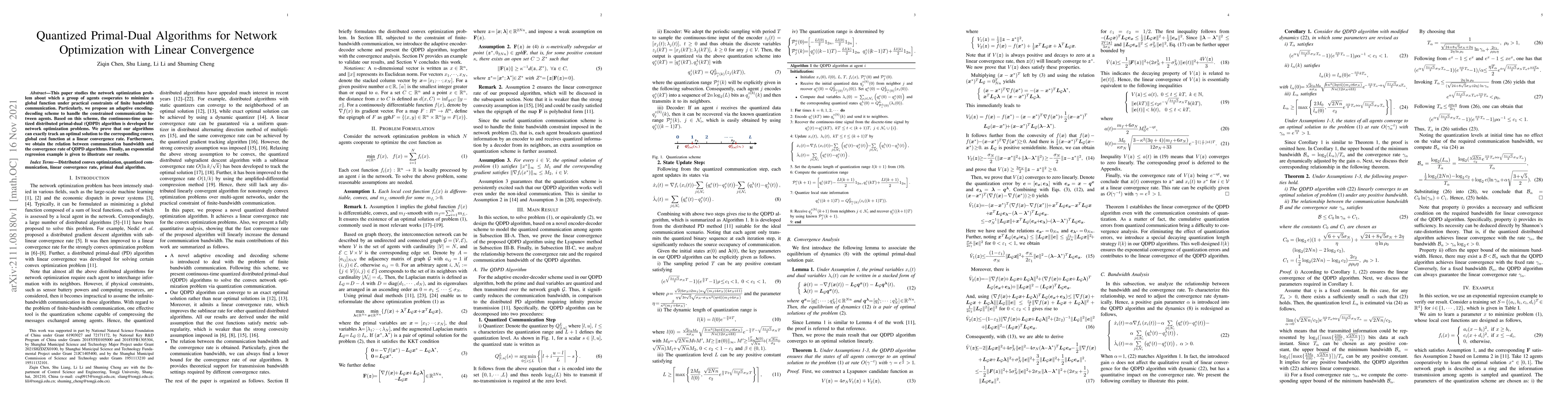 This paper proposes a quantized distributed primal-dual algorithm (QDPD) for network optimization under communication constraints, demonstrating linear convergence and deriving a relationship between bandwidth and convergence rate. An example of exponential regression illustrates the practical application of the proposed method.