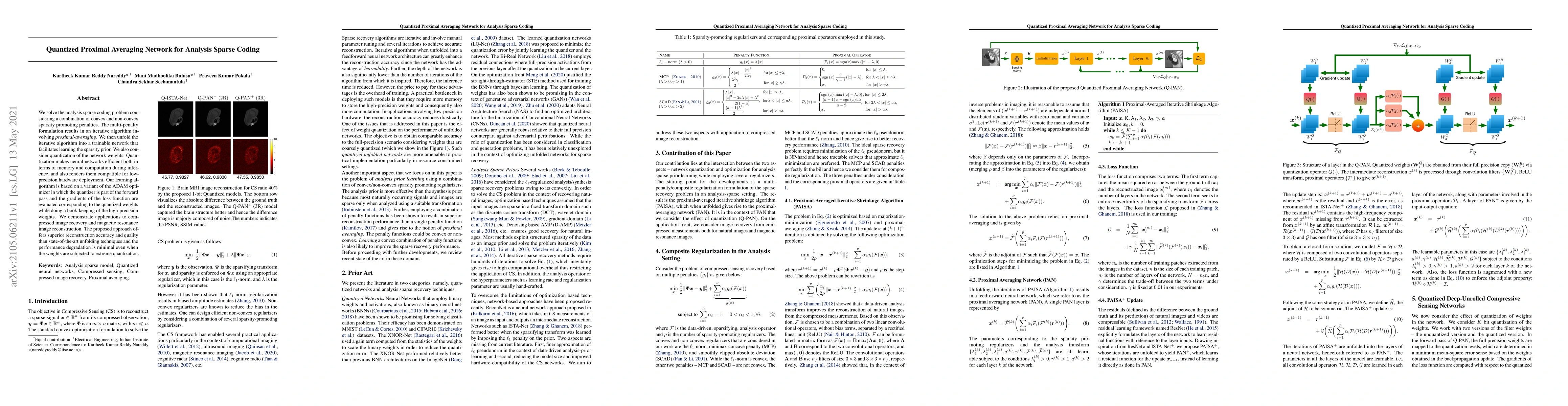 This paper proposes a quantized proximal averaging network for analysis sparse coding, combining convex and non-convex penalties to solve the problem. The network, trained with a variant of the ADAM optimizer, demonstrates superior reconstruction accuracy in applications like compressed image recovery and magnetic resonance imaging, while maintaining efficiency through weight quantization.