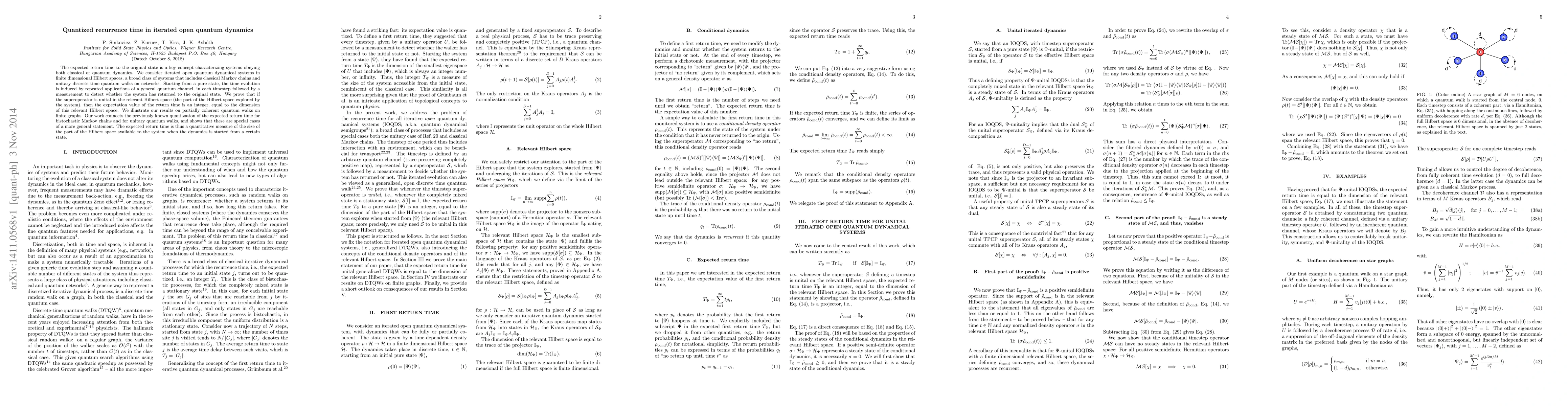 The expected return time to the original state is a key concept characterizing systems obeying both classical or quantum dynamics. We consider iterated open quantum dynamical systems in finite dimensional Hilbert spaces, a broad class of systems that includes classical Markov chains and unitary discrete time quantum walks on networks. Starting from a pure state, the time evolution is induced by repeated applications of a general quantum channel, in each timestep followed by a measurement to detect whether the system has returned to the original state. We prove that if the superoperator is unital in the relevant Hilbert space (the part of the Hilbert space explored by the system), then the expectation value of the return time is an integer, equal to the dimension of this relevant Hilbert space. We illustrate our results on partially coherent quantum walks on finite graphs. Our work connects the previously known quantization of the expected return time for bistochastic Markov chains and for unitary quantum walks, and shows that these are special cases of a more general statement. The expected return time is thus a quantitative measure of the size of the part of the Hilbert space available to the system when the dynamics is started from a certain state.
