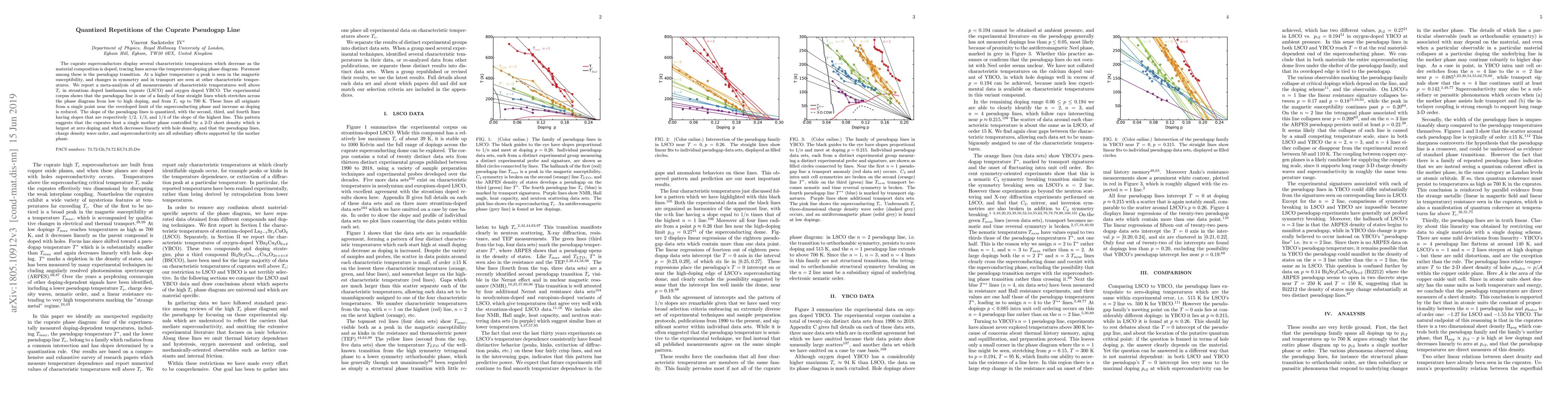 The cuprate superconductors display several characteristic temperatures which decrease as the material composition is doped, tracing lines across the temperature-doping phase diagram. Foremost among these is the pseudogap transition. At a higher temperature a peak is seen in the magnetic susceptibility, and changes in symmetry and in transport are seen at other characteristic temperatures. We report a meta-analysis of all measurements of characteristic temperatures well above $T_c$ in strontium doped lanthanum cuprate (LSCO) and oxygen doped YBCO. The experimental corpus shows that the pseudogap line is one of a family of four straight lines which stretches across the phase diagram from low to high doping, and from $T_c$ up to $700$ K. These lines all originate from a single point near the overdoped limit of the superconducting phase and increase as doping is reduced. The slope of the pseudogap lines is quantized, with the second, third, and fourth lines having slopes that are respectively $1/2,\;1/3,$ and $1/4$ of the slope of the highest line. This pattern suggests that the cuprates host a single mother phase controlled by a 2-D sheet density which is largest at zero doping and which decreases linearly with hole density, and that the pseudogap lines, charge density wave order, and superconductivity are all subsidiary effects supported by the mother phase.