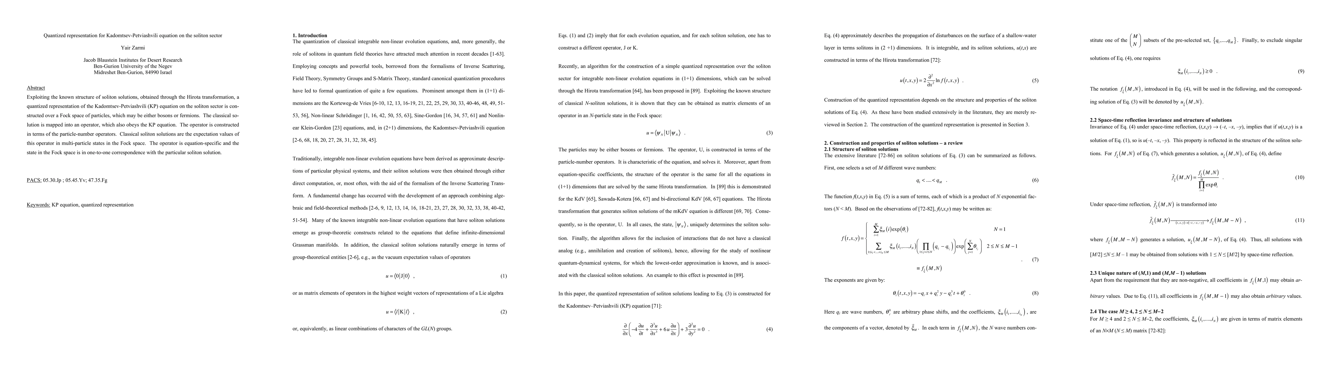 Exploiting the known structure of soliton solutions, obtained through the Hirota transformation, a quantized representation of the Kadomtsev-Petviashvili (KP) equation on the soliton sector is constructed over a Fock space of particles, which may be either bosons or fermions. The classical solution is mapped into an operator, which also obeys the KP equation. The operator is constructed in terms of the particle-number operators. Classical soliton solutions are the expectation values of this operator in multi-particle states in the Fock space. The operator is equation-specific and the state in the Fock space is in one-to-one correspondence with the particular soliton solution.