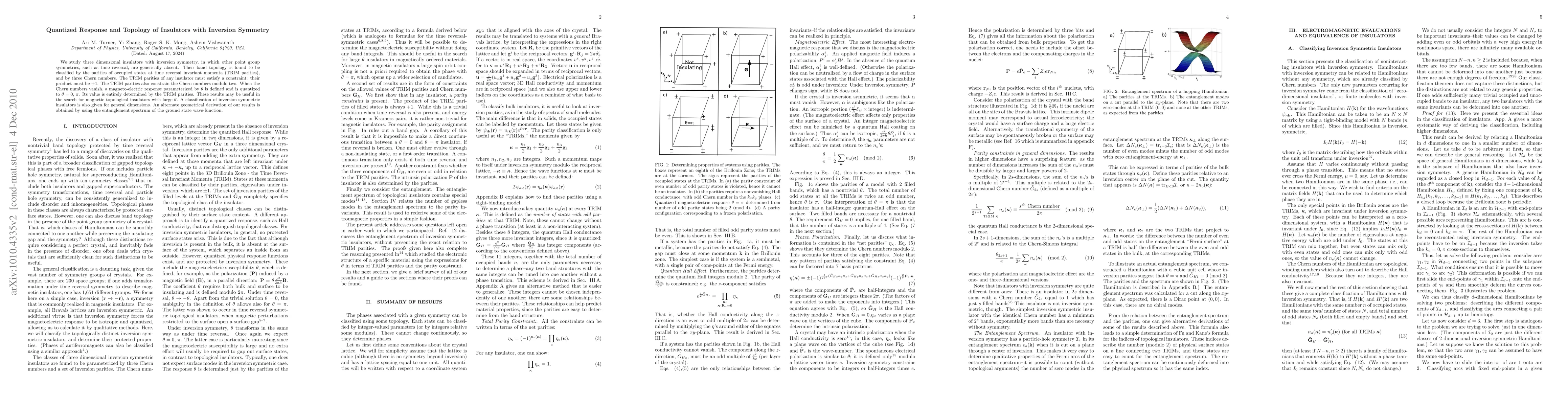 This paper classifies three-dimensional insulators with inversion symmetry, revealing their band topology is determined by TRIM parities and Chern numbers. It finds that the product of TRIM parities must be +1, and when Chern numbers vanish, a quantized magneto-electric response is defined by the TRIM parities.