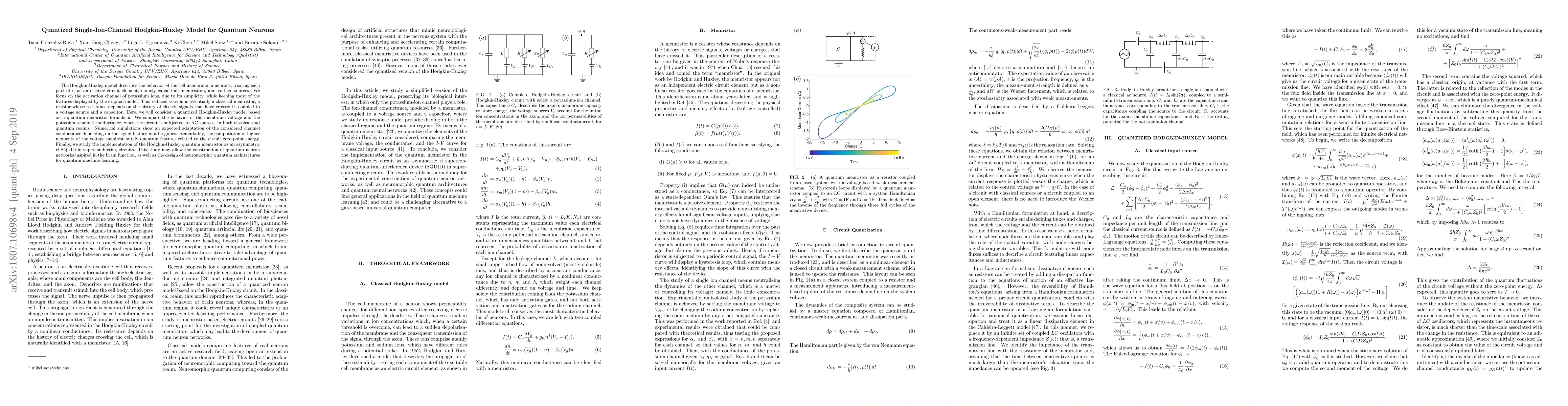 This paper quantizes the Hodgkin-Huxley model focusing on potassium ion channels, proposing a quantum memristor formalism. It highlights quantum features in voltage moments and explores its implementation as an asymmetric rf SQUID, suggesting potential for quantum neuron networks and machine learning.