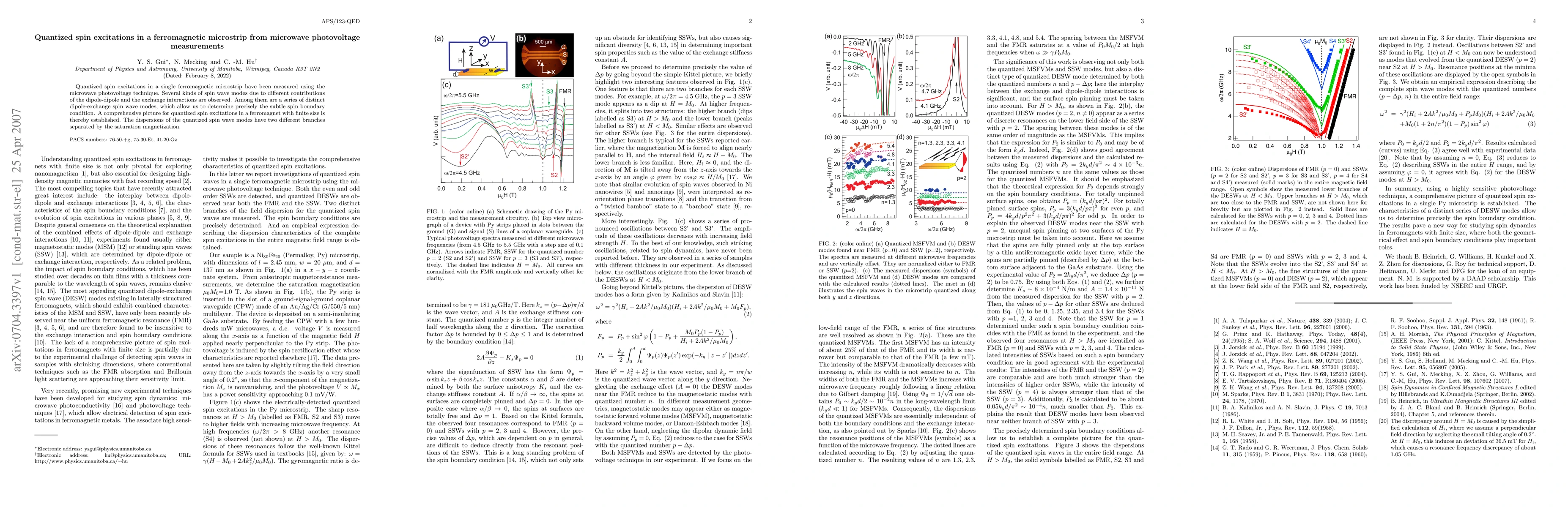 This study measures quantized spin excitations in a ferromagnetic microstrip using microwave photovoltage, revealing various spin wave modes from dipole-dipole and exchange interactions. The research establishes a detailed picture of finite-size ferromagnetic spin excitations, identifying distinct dipole-exchange spin wave modes and their dispersions.