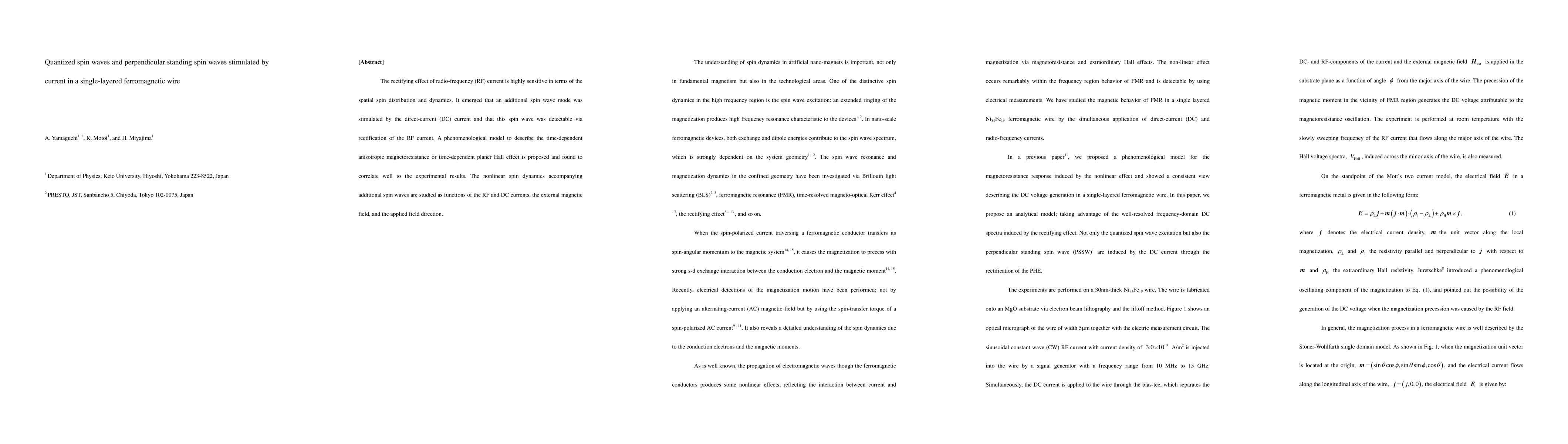 This paper investigates the effects of radio-frequency (RF) and direct-current (DC) on spin waves in a single-layered ferromagnetic wire, revealing a new detectable spin wave mode. A proposed phenomenological model correlates well with experimental results, highlighting the nonlinear spin dynamics influenced by RF and DC currents, magnetic fields, and field directions.