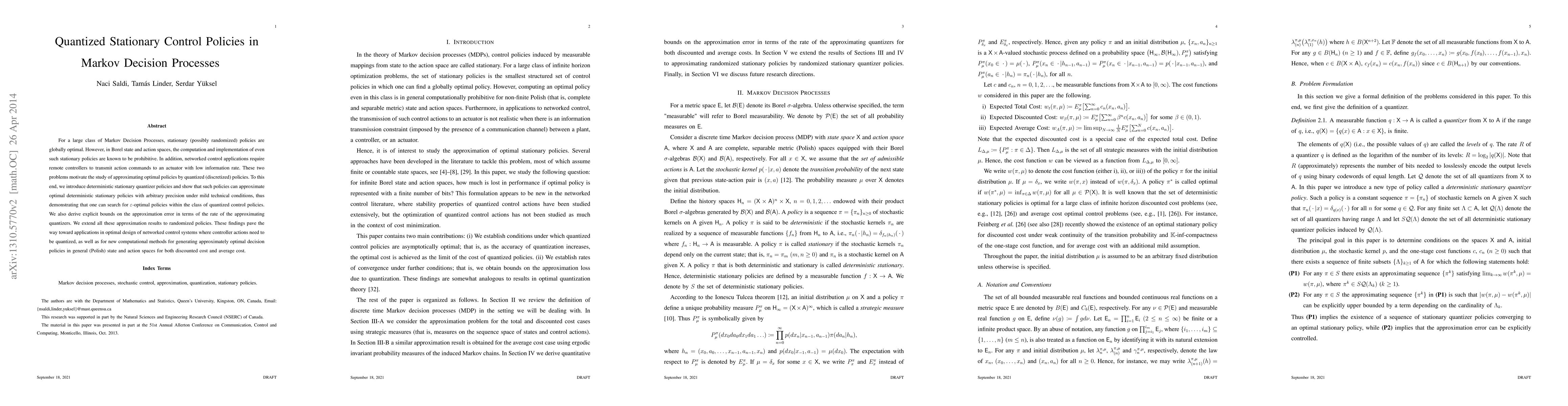 This paper explores the approximation of optimal stationary policies in Markov Decision Processes (MDPs) using quantized policies, demonstrating that such discretized policies can achieve near-optimality with arbitrary precision. It also provides explicit bounds on the approximation error based on the quantization rate, extending these results to randomized policies.