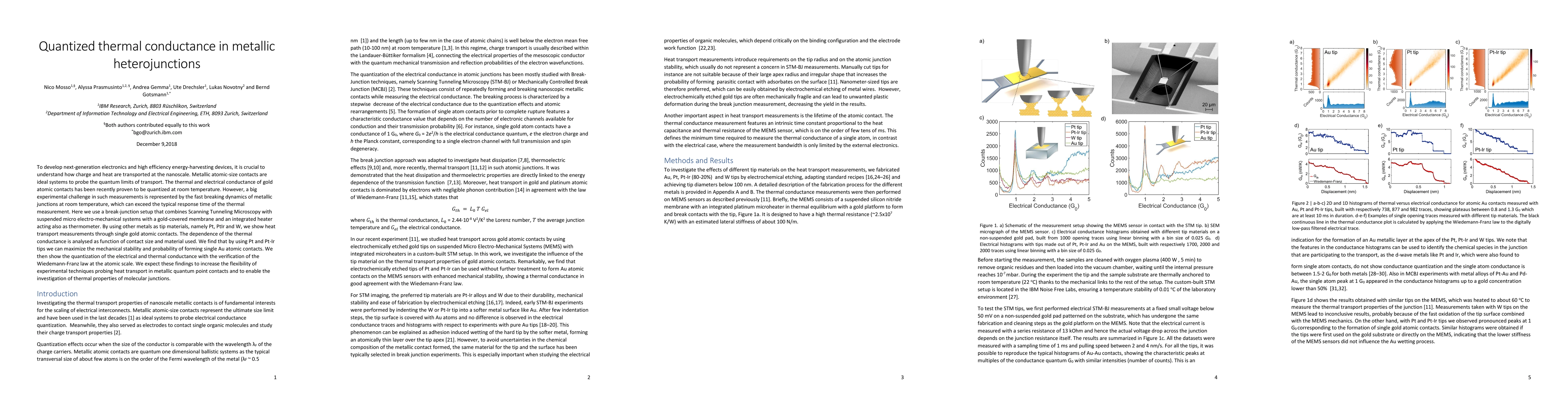This study investigates quantized thermal and electrical conductance in gold atomic contacts using metallic heterojunctions with tips made from Pt, PtIr, and W. The research demonstrates enhanced stability and probability of forming single Au atomic contacts using Pt and Pt-Ir tips, confirming quantization and verifying the Wiedemann-Franz law at the atomic scale, which could advance techniques for probing heat transport at the nanoscale.