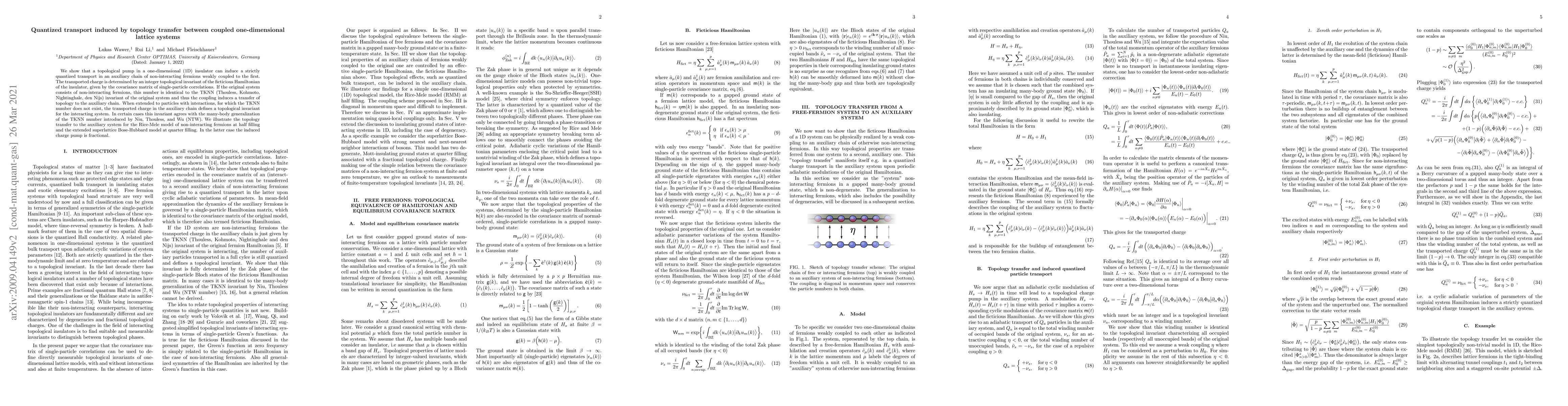 We show that a topological pump in a one-dimensional (1D) insulator can induce a strictly quantized transport in an auxiliary chain of non-interacting fermions weakly coupled to the first. The transported charge is determined by an integer topological invariant of the ficticious Hamiltonian of the insulator, given by the covariance matrix of single-particle correlations. If the original system consists of non-interacting fermions, this number is identical to the TKNN (Thouless, Kohmoto, Nightinghale, den Nijs) invariant of the original system and thus the coupling induces a transfer of topology to the auxiliary chain. When extended to particles with interactions, for which the TKNN number does not exist, the transported charge in the auxiliary chain defines a topological invariant for the interacting system. In certain cases this invariant agrees with the many-body generalization of the TKNN number introduced by Niu, Thouless, and Wu (NTW). We illustrate the topology transfer to the auxiliary system for the Rice-Mele model of non-interacting fermions at half filling and the extended superlattice Bose-Hubbard model at quarter filling. In the latter case the induced charge pump is fractional.