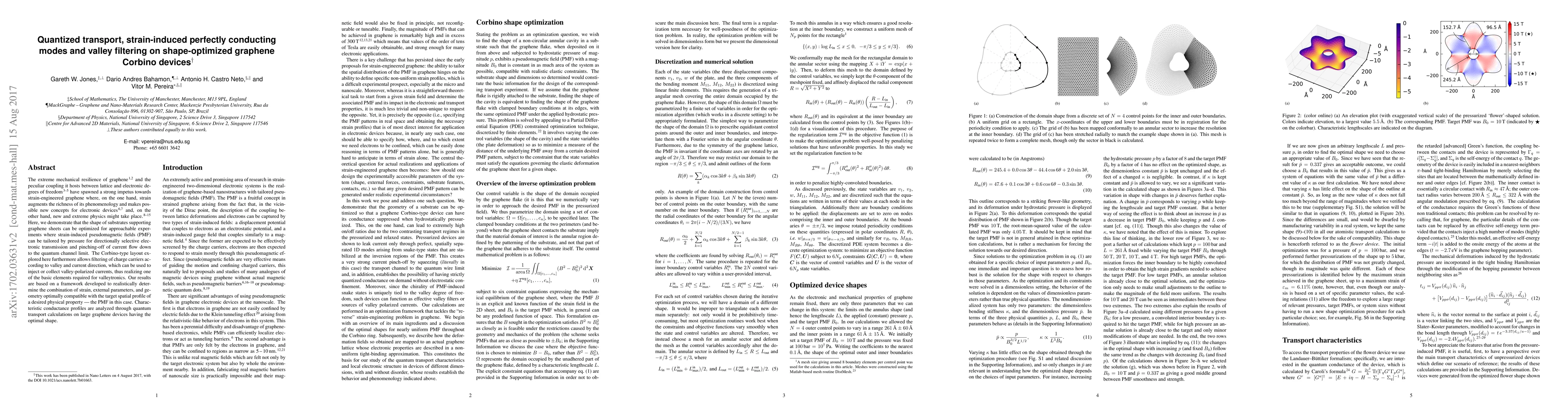 This paper investigates the use of strain-engineered graphene on optimized Corbino devices to achieve quantized transport, perfectly conducting modes, and valley filtering. The study demonstrates directional electronic transmission and current flow control via tailored pseudomagnetic fields, enabling valley-polarized current injection and collection essential for valleytronics.