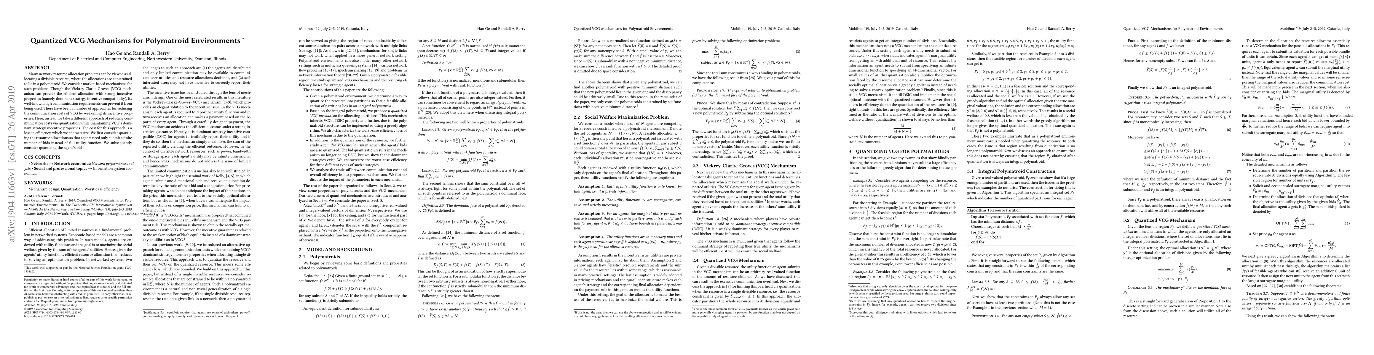 Many network resource allocation problems can be viewed as allocating a divisible resource, where the allocations are constrained to lie in a polymatroid. We consider market-based mechanisms for such problems. Though the Vickrey-Clarke-Groves (VCG) mechanism can provide the efficient allocation with strong incentive properties (namely dominant strategy incentive compatibility), its well-known high communication requirements can prevent it from being used. There have been a number of approaches for reducing the communication costs of VCG by weakening its incentive properties. Here, instead we take a different approach of reducing communication costs via quantization while maintaining VCG's dominant strategy incentive properties. The cost for this approach is a loss in efficiency which we characterize. We first consider quantizing the resource allocations so that agents need only submit a finite number of bids instead of full utility function. We subsequently consider quantizing the agent's bids.