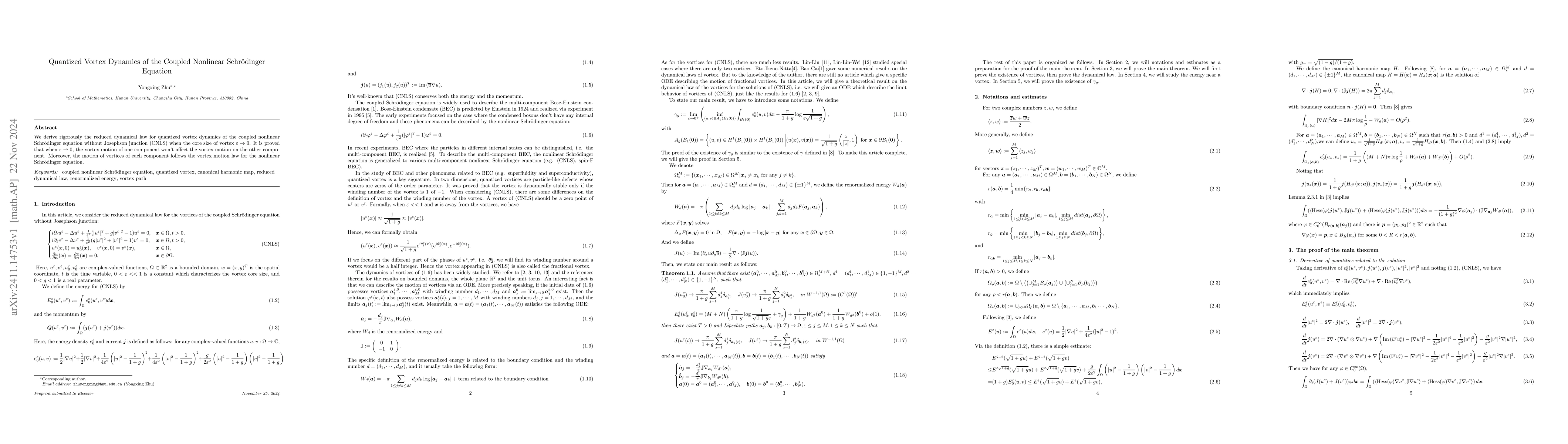 Title: Quantized Vortex Dynamics of the Coupled Nonlinear Schrödinger Equation Summary: The study rigorously derives the reduced dynamical law for quantized vortex dynamics in the coupled nonlinear Schrödinger equation, proving that as the vortex core size approaches zero, vortex motion in one component does not affect the other, and each component's vortex follows the law of the nonlinear Schrödinger equation.