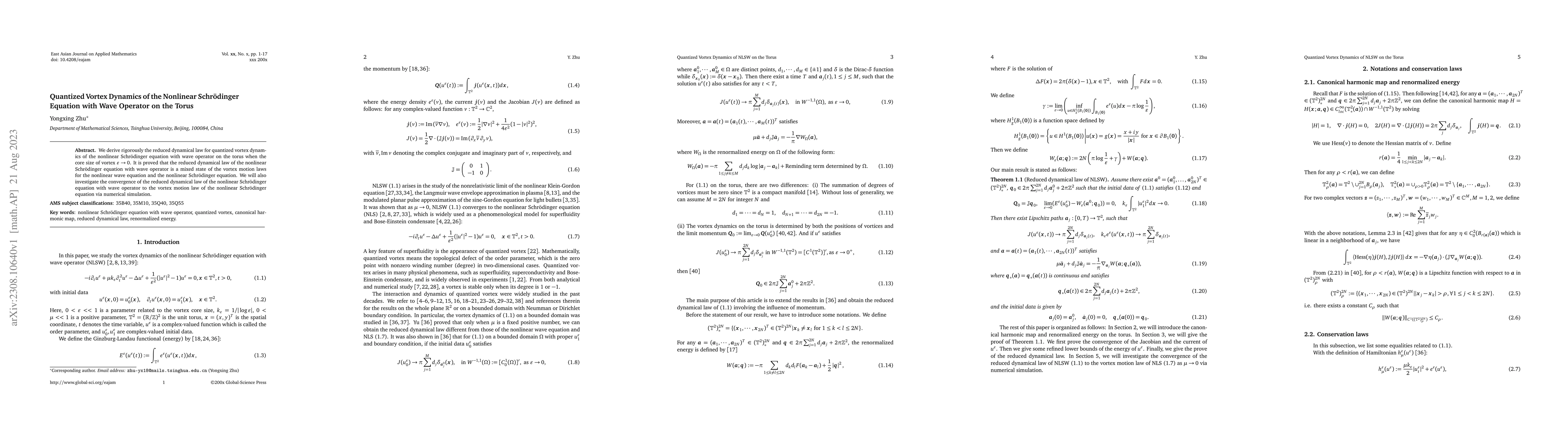 This paper rigorously derives the reduced dynamical law for quantized vortex dynamics in the nonlinear Schrödinger equation with a wave operator on a torus as the vortex core size approaches zero. It establishes that this law is a mixed state of vortex motion laws for both the nonlinear wave equation and the nonlinear Schrödinger equation, and it explores the convergence of this law to the Schrödinger equation's vortex motion through numerical simulations.
