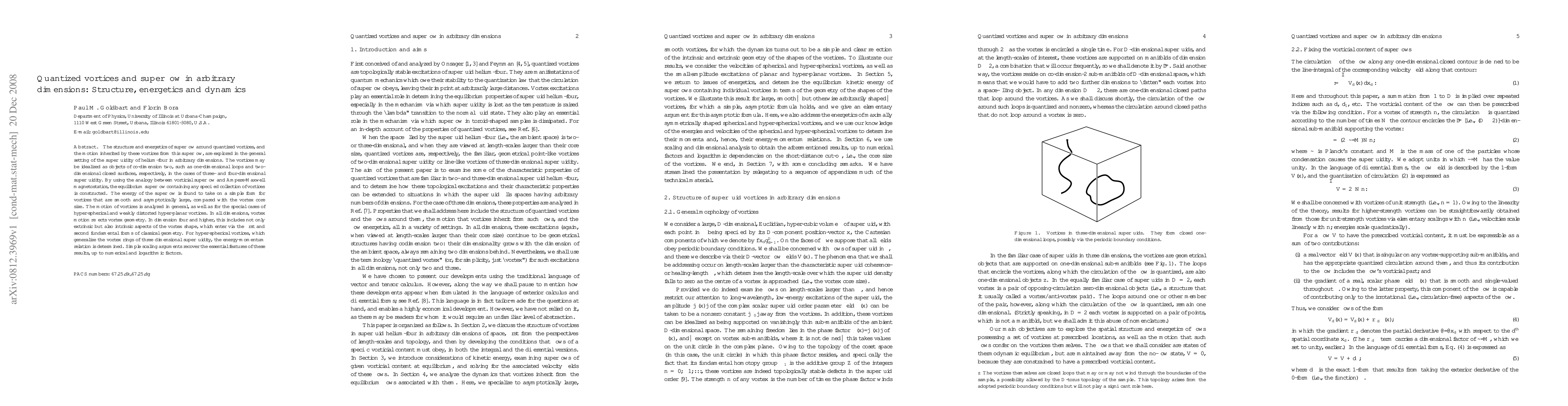 The structure and energetics of superflow around quantized vortices, and the motion inherited by these vortices from this superflow, are explored in the general setting of the superfluidity of helium-four in arbitrary dimensions. The vortices may be idealized as objects of co-dimension two, such as one-dimensional loops and two-dimensional closed surfaces, respectively, in the cases of three- and four-dimensional superfluidity. By using the analogy between vorticial superflow and Ampere-Maxwell magnetostatics, the equilibrium superflow containing any specified collection of vortices is constructed. The energy of the superflow is found to take on a simple form for vortices that are smooth and asymptotically large, compared with the vortex core size. The motion of vortices is analyzed in general, as well as for the special cases of hyper-spherical and weakly distorted hyper-planar vortices. In all dimensions, vortex motion reflects vortex geometry. In dimension four and higher, this includes not only extrinsic but also intrinsic aspects of the vortex shape, which enter via the first and second fundamental forms of classical geometry. For hyper-spherical vortices, which generalize the vortex rings of three dimensional superfluidity, the energy-momentum relation is determined. Simple scaling arguments recover the essential features of these results, up to numerical and logarithmic factors.