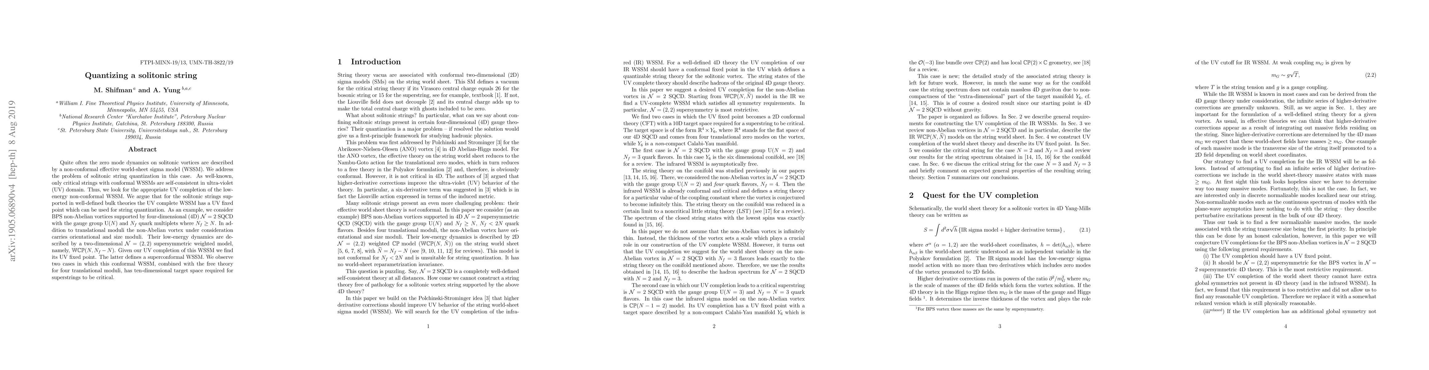 Quite often the zero mode dynamics on solitonic vortices are described by a non-conformal effective world-sheet sigma model (WSSM). We address the problem of solitonic string quantization in this case. As well-known, only crfitical strings with superconformal WSSMs are self-consistent in ultra-violet (UV) domain. Thus, we look for the appropriate UV completion of the low-energy non-conformal WSSM. We ague that for the solitonic strings supported in well-defined bulk theories the UV complete WSSM has a UV fixed point which can be used for string quantization. As an example, we consider BPS non-Abelian vortices supported by four-dimensional (4D) \ntwo SQCD with the gauge group U$(N)$ and $N_f$ quark multiplets where $N_f\ge N$. In addition to translational moduli the non-Abelian vortex under consideration carries orientational and size moduli. Their low-energy dynamics are described by a two-dimensional \ntwot supersymmetric weighted model, namely, $\mathbb{WCP}(N, N_f-N)$. Given our UV completion of this WSSM we find its UV fixed point. The latter defines a superconformal WSSM. We observe two cases in which this conformal WSSM, combined with the free theory for four translational moduli, has ten-dimensional target space required for superstrings to be critical.