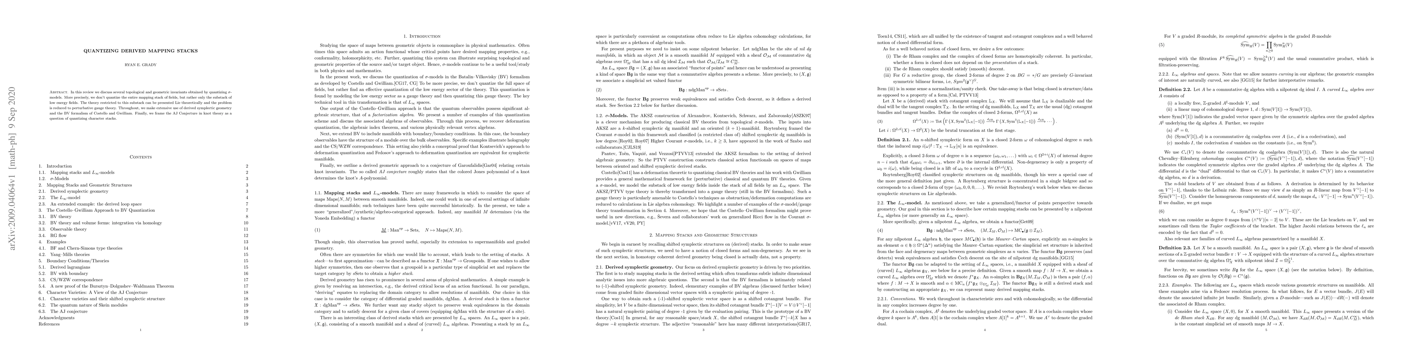 In this review we discuss several topological and geometric invariants obtained by quantizing $\sigma$-models. More precisely, we don't quantize the entire mapping stack of fields, but rather only the substack of low energy fields. The theory restricted to this substack can be presented Lie theoretically and the problem is reduced to perturbative gauge theory. Throughout, we make extensive use of derived symplectic geometry and the BV formalism of Costello and Gwilliam. Finally, we frame the AJ Conjecture in knot theory as a question of quantizing character stacks.