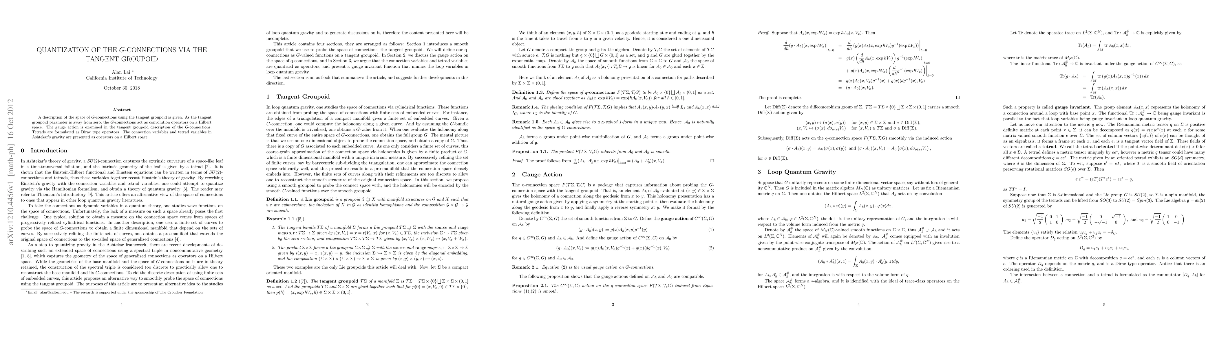 This paper quantizes G-connections using the tangent groupoid, showing that these connections act as convolution operators on a Hilbert space. It examines the gauge action within this framework and formulates tetrads as Dirac type operators, presenting connection and tetrad variables in Ashtekar's gravity as operators on a Hilbert space.