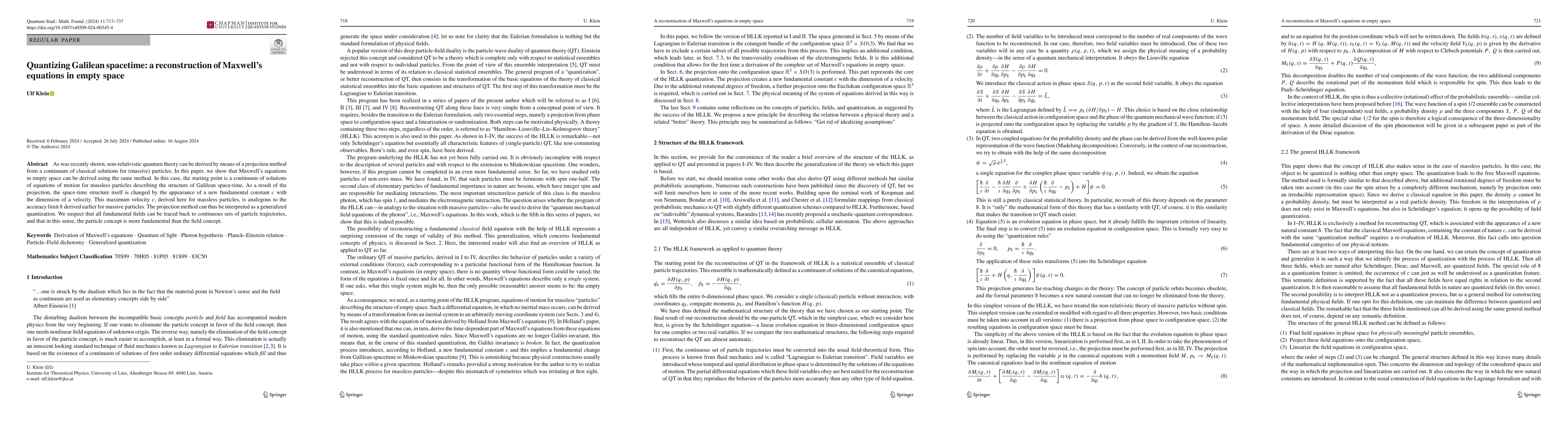 This paper reconstructs Maxwell's equations in empty space by projecting classical solutions of massless particle equations of motion within Galilean spacetime, introducing a fundamental constant $c$ analogous to $\hbar$ in quantum theory. The authors propose that the particle concept may be more fundamental than the field concept.
