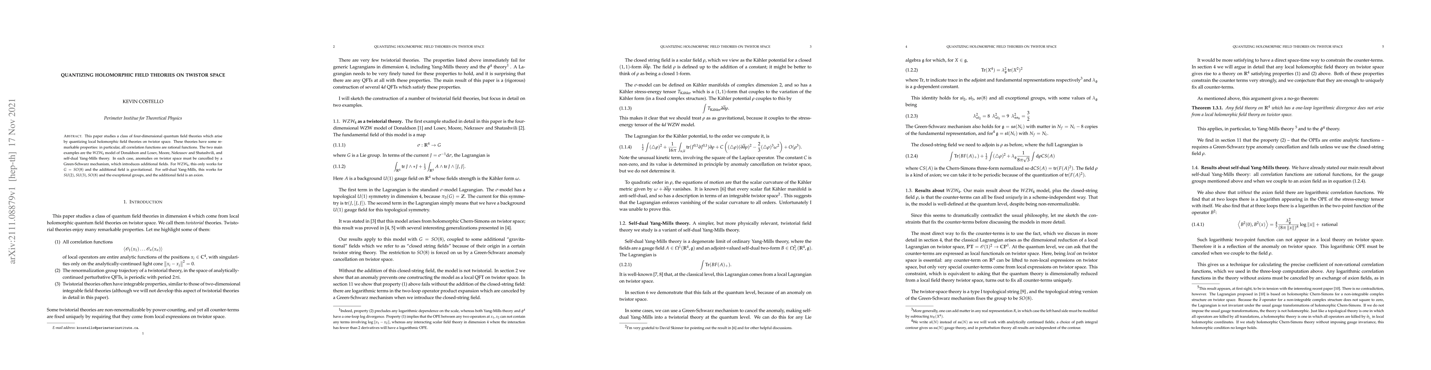 This paper studies a class of four-dimensional quantum field theories which arise by quantizing local holomorphic field theories on twistor space. These theories have some remarkable properties: in particular, all correlation functions are rational functions. The two main examples are the $WZW_4$ model of Donaldson and Losev, Moore, Nekrasov and Shatashvili, and self-dual Yang-Mills theory. In each case, anomalies on twistor space must be cancelled by a Green-Schwarz mechanism, which introduces additional fields. For $WZW_4$, this only works for $G = SO(8)$ and the additional field is gravitational. For self-dual Yang-Mills, this works for $SU(2)$, $SU(3)$, $SO(8)$ and the exceptional groups, and the additional field is an axion.