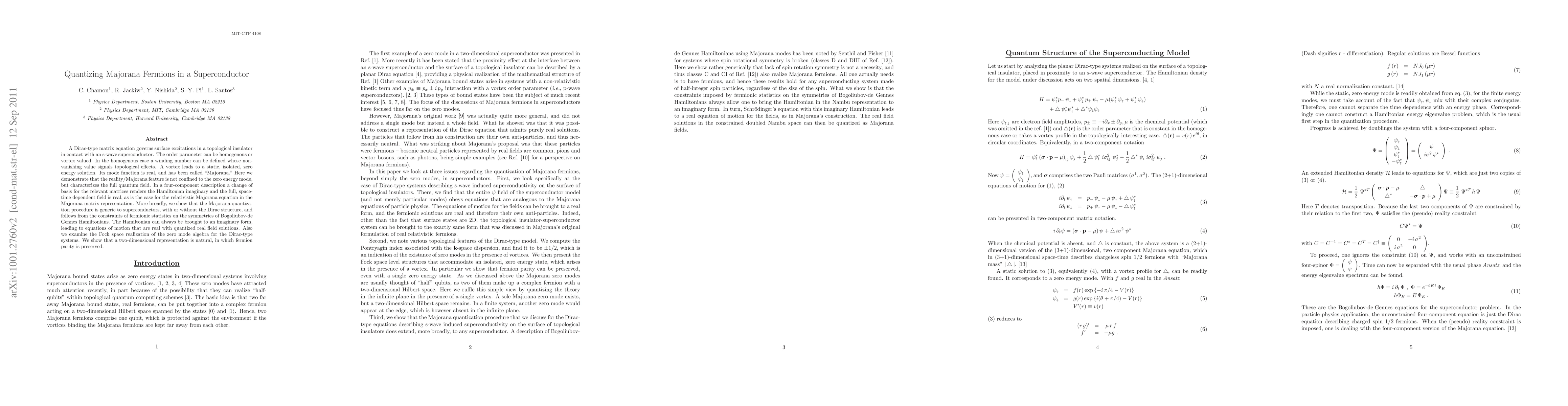 A Dirac-type matrix equation governs surface excitations in a topological insulator in contact with an s-wave superconductor. The order parameter can be homogenous or vortex valued. In the homogenous case a winding number can be defined whose non-vanishing value signals topological effects. A vortex leads to a static, isolated, zero energy solution. Its mode function is real, and has been called "Majorana." Here we demonstrate that the reality/Majorana feature is not confined to the zero energy mode, but characterizes the full quantum field. In a four-component description a change of basis for the relevant matrices renders the Hamiltonian imaginary and the full, space-time dependent field is real, as is the case for the relativistic Majorana equation in the Majorana matrix representation. More broadly, we show that the Majorana quantization procedure is generic to superconductors, with or without the Dirac structure, and follows from the constraints of fermionic statistics on the symmetries of Bogoliubov-de Gennes Hamiltonians. The Hamiltonian can always be brought to an imaginary form, leading to equations of motion that are real with quantized real field solutions. Also we examine the Fock space realization of the zero mode algebra for the Dirac-type systems. We show that a two-dimensional representation is natural, in which fermion parity is preserved.