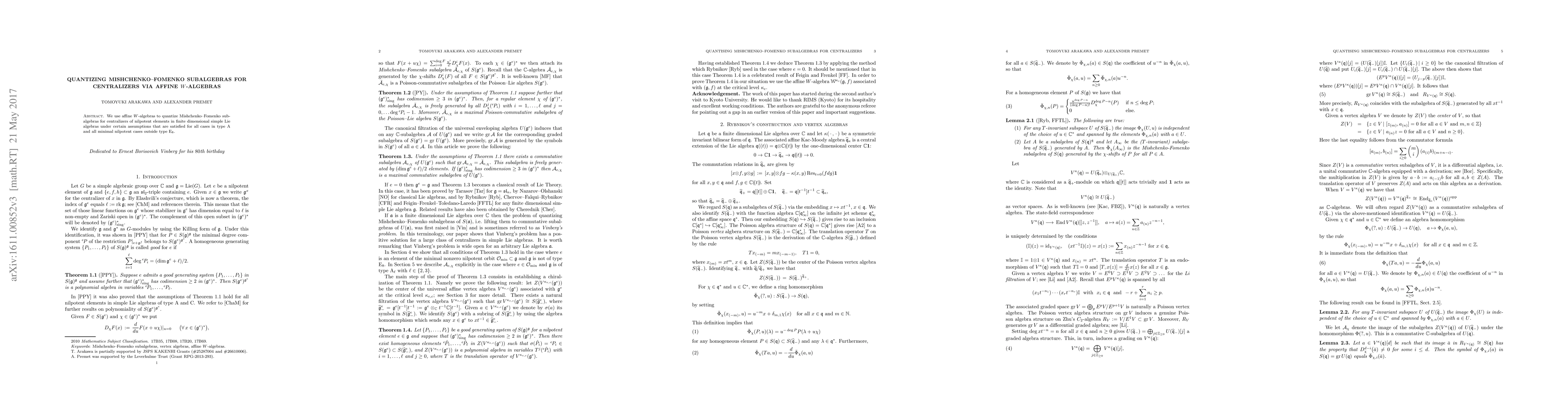 Summary: This paper quantizes Mishchenko-Fomenko subalgebras for centralizers of nilpotent elements in simple Lie algebras using affine W-algebras, focusing on type A cases and minimal nilpotent cases outside type $E_8$. The method provides a framework for understanding these subalgebras within a quantum algebraic context.