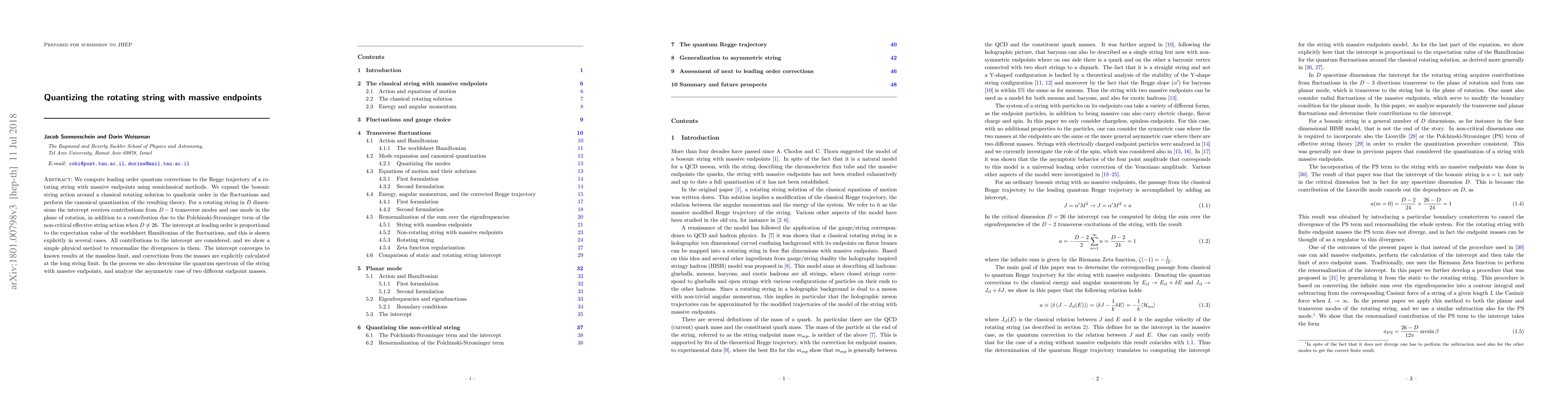 This paper quantizes a rotating string with massive endpoints, calculating leading order quantum corrections to its Regge trajectory. It employs semiclassical methods to determine the quantum spectrum and intercept contributions from various modes, including renormalization of divergences and analysis of asymmetric endpoint masses.