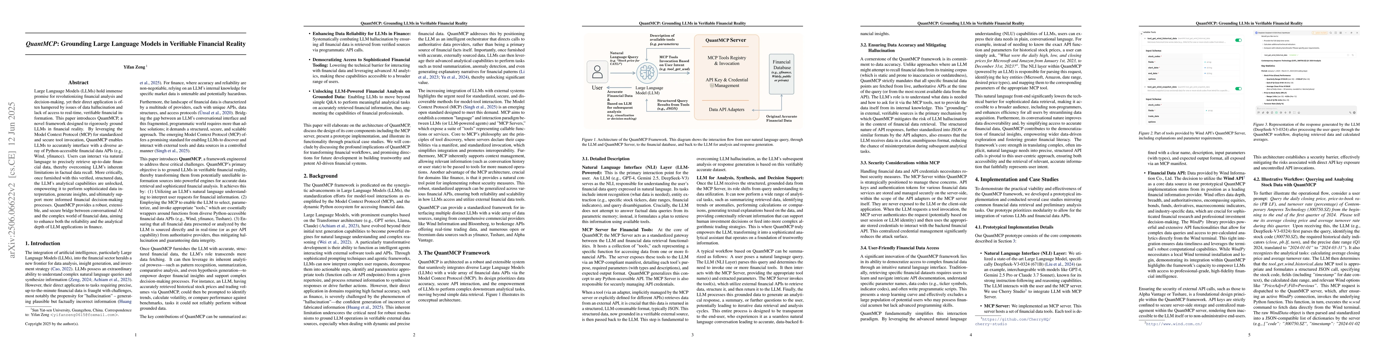 Large Language Models (LLMs) hold immense promise for revolutionizing financial analysis and decision-making, yet their direct application is often hampered by issues of data hallucination and lack of access to real-time, verifiable financial information. This paper introduces QuantMCP, a novel framework designed to rigorously ground LLMs in financial reality. By leveraging the Model Context Protocol (MCP) for standardized and secure tool invocation, QuantMCP enables LLMs to accurately interface with a diverse array of Python-accessible financial data APIs (e.g., Wind, yfinance). Users can interact via natural language to precisely retrieve up-to-date financial data, thereby overcoming LLM's inherent limitations in factual data recall. More critically, once furnished with this verified, structured data, the LLM's analytical capabilities are unlocked, empowering it to perform sophisticated data interpretation, generate insights, and ultimately support more informed financial decision-making processes. QuantMCP provides a robust, extensible, and secure bridge between conversational AI and the complex world of financial data, aiming to enhance both the reliability and the analytical depth of LLM applications in finance.