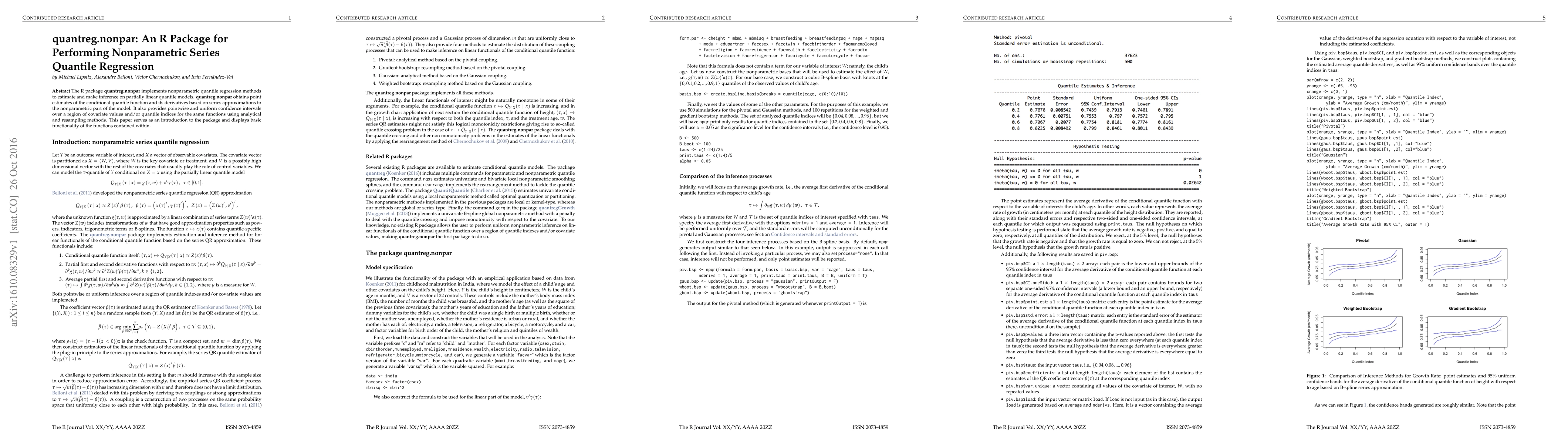 The quantreg.nonpar package offers a technical contribution by providing a comprehensive set of tools for nonparametric quantile regression, including estimation, inference, and visualization functionalities.