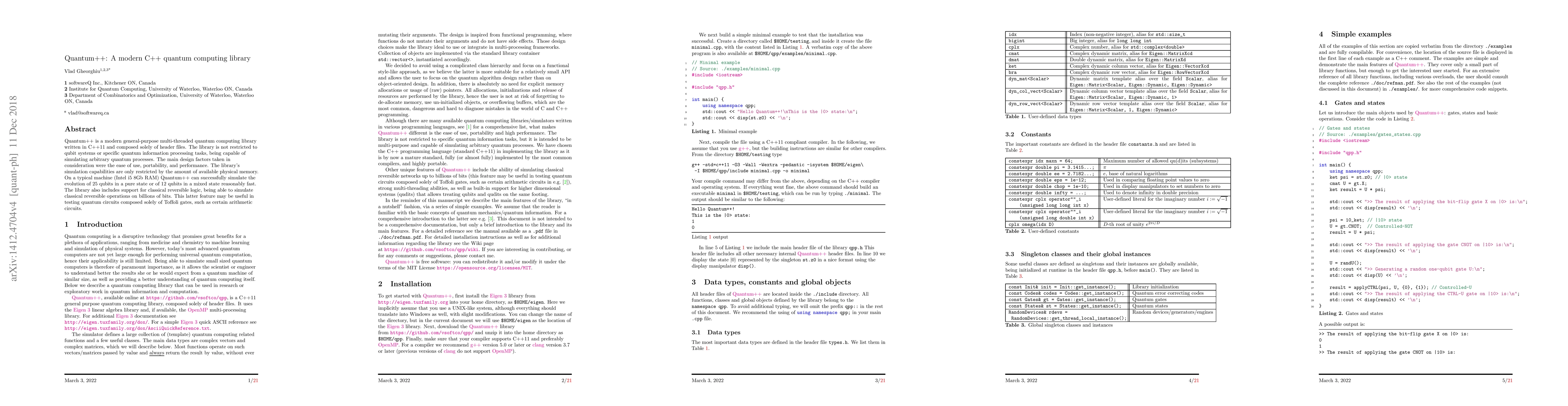Quantum++ is a modern C++ quantum computing library that provides a general-purpose, multi-threaded approach to quantum computing simulation. It is written in C++11 and consists solely of header files, ensuring portability and ease of use.
