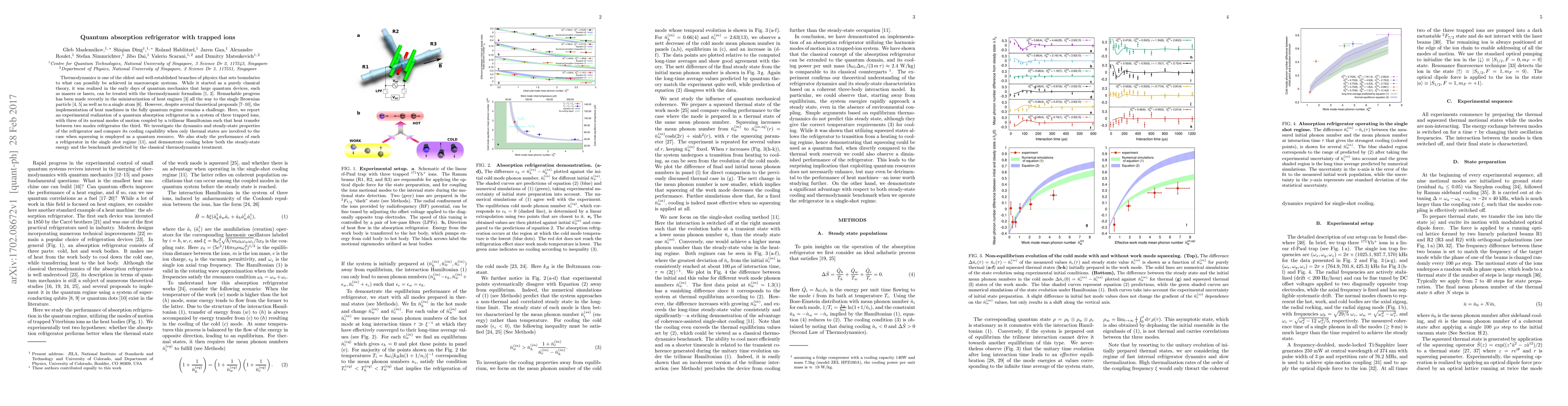 This paper reports an experimental realization of a quantum absorption refrigerator using three trapped ions, demonstrating cooling below classical thermodynamic limits and exploring the dynamics and steady-state properties of the system, including the use of squeezing as a quantum resource for enhanced cooling performance.