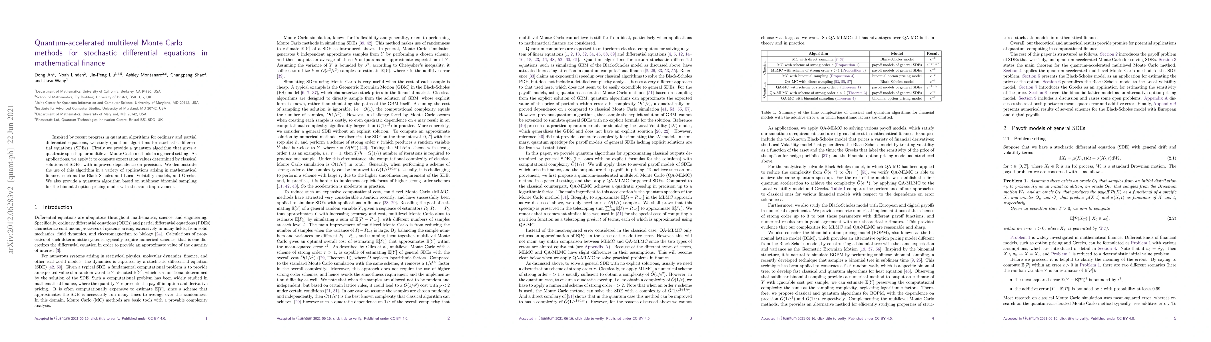This paper proposes quantum algorithms offering quadratic speed-ups for multilevel Monte Carlo methods to solve stochastic differential equations, significantly enhancing precision dependence. Applications in mathematical finance, including the Black-Scholes and Local Volatility models, benefit from these advancements.
