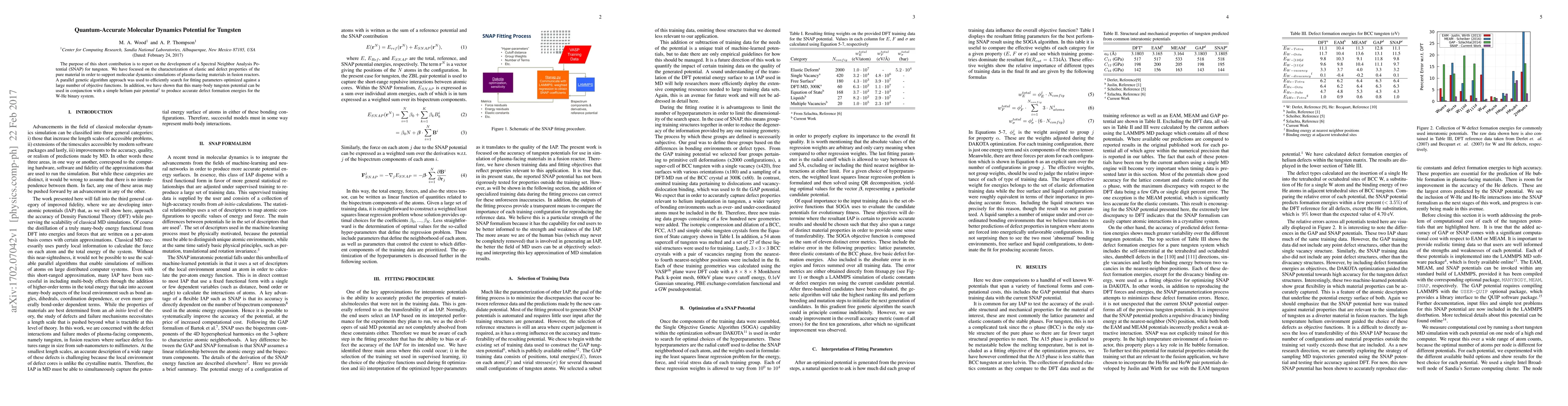 The purpose of this short contribution is to report on the development of a Spectral Neighbor Analysis Potential (SNAP) for tungsten. We have focused on the characterization of elastic and defect properties of the pure material in order to support molecular dynamics simulations of plasma-facing materials in fusion reactors. A parallel genetic algorithm approach was used to efficiently search for fitting parameters optimized against a large number of objective functions. In addition, we have shown that this many-body tungsten potential can be used in conjunction with a simple helium pair potential to produce accurate defect formation energies for the W-He binary system.