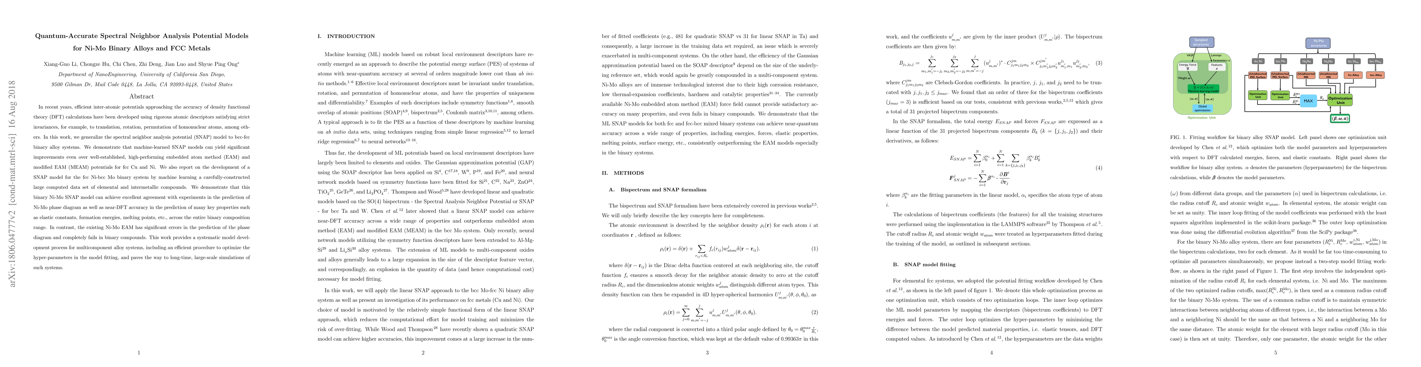 This paper develops a quantum-accurate spectral neighbor analysis potential (SNAP) model for Ni-Mo binary alloys, demonstrating significant improvements over existing embedded atom method (EAM) and modified EAM (MEAM) potentials. The SNAP model achieves near-DFT accuracy in predicting properties and phase diagrams, outperforming traditional methods and enabling efficient large-scale simulations of multicomponent alloy systems.